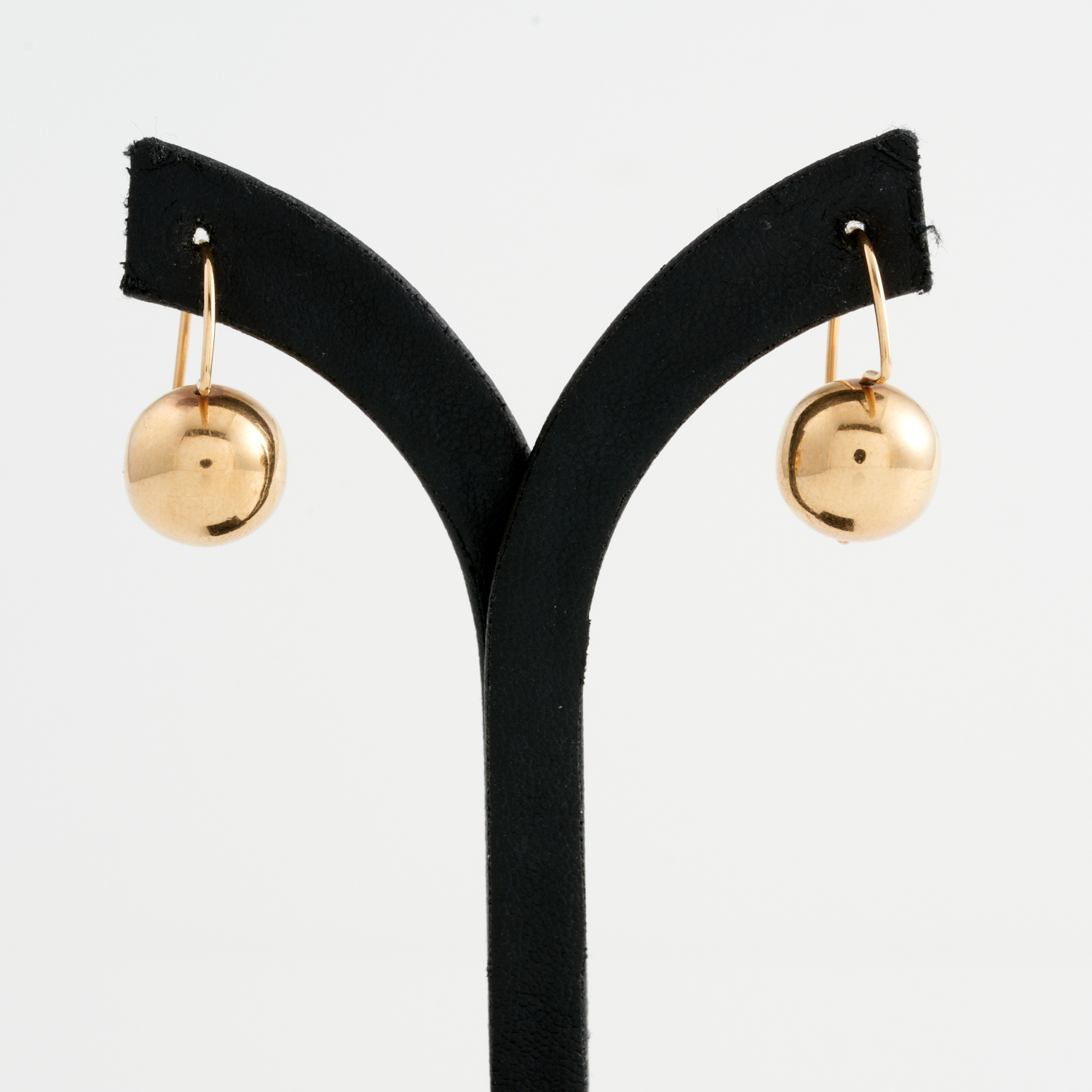 A PAIR OF BALL DROP EARRINGS IN 9CT GOLD TO HOOK AND CLASP FITTINGS, 23MM IN LENGTH, TOTAL WEIGHT 3.81GMS