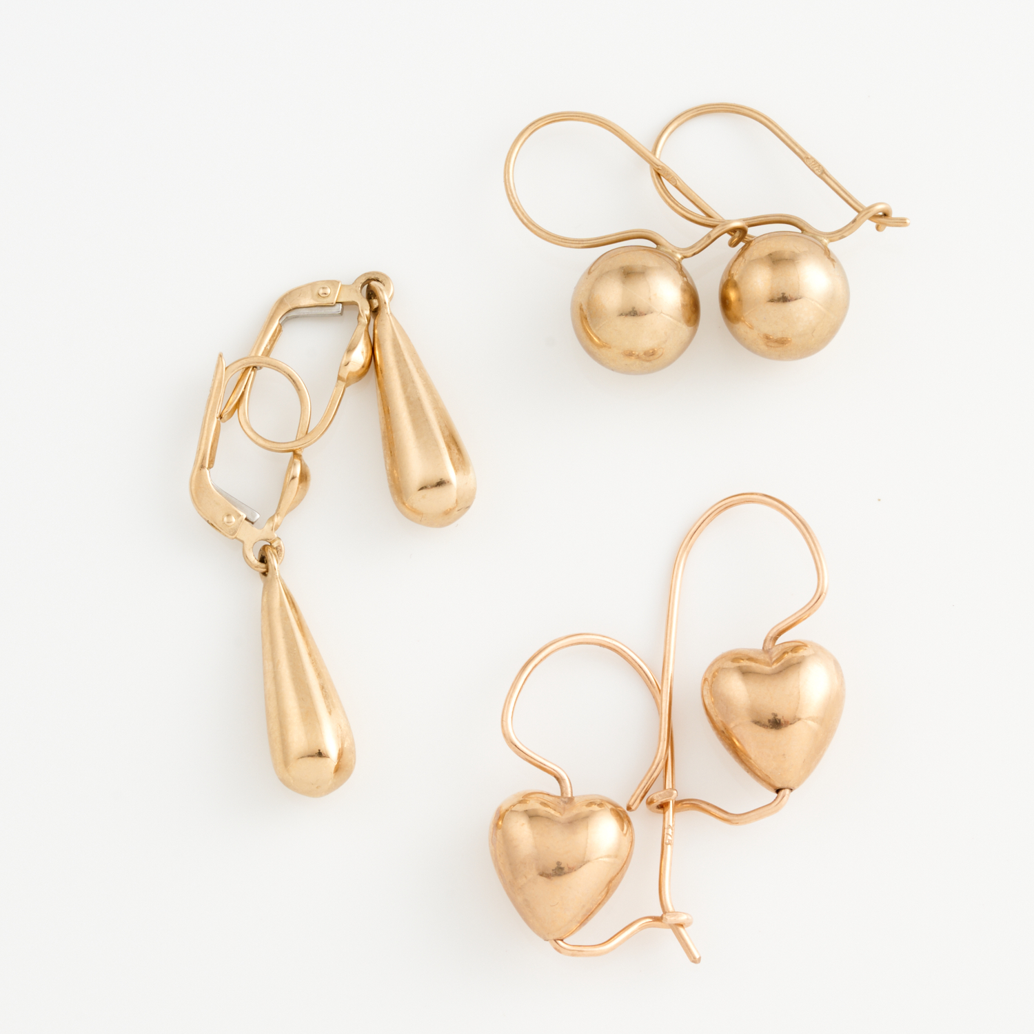 A COLLECTION OF DROP EARRINGS IN 9CT GOLD TO HOOK AND CLASP FITTINGS, OF BALL, TEAR DROP, AND HEART DESIGN, TOTAL COMBINED WEIGHT 7.00GMS