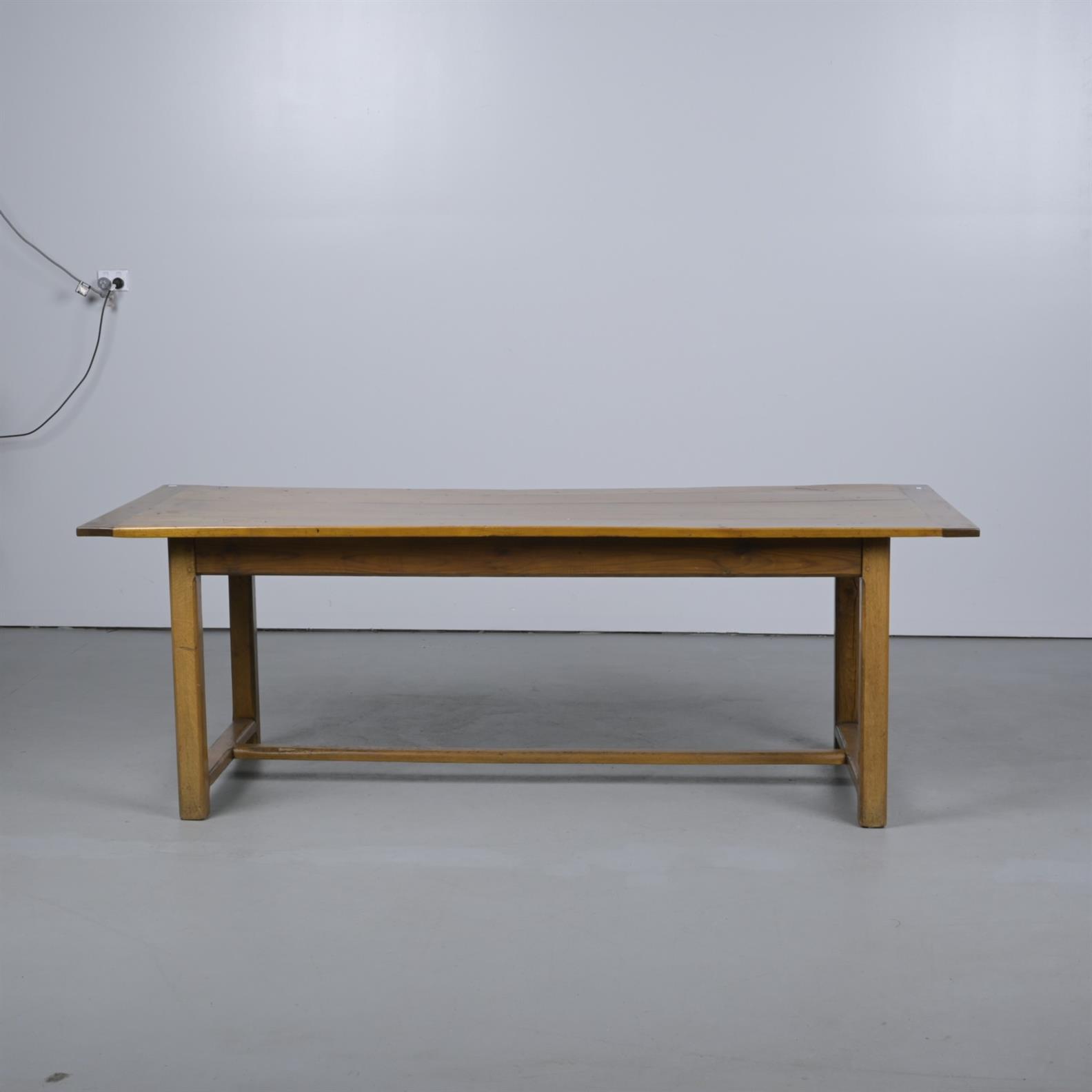 A FRENCH CHERRY AND OAK DINING TABLE IN EARLY 19th CENTURY PROVINCIAL STYLE, WITH EXTENTION LEAVES TO EACH END AND A PAIR OF DRAWERS TO ONE SIDE (74CM H X 215CM W X 88CM D)