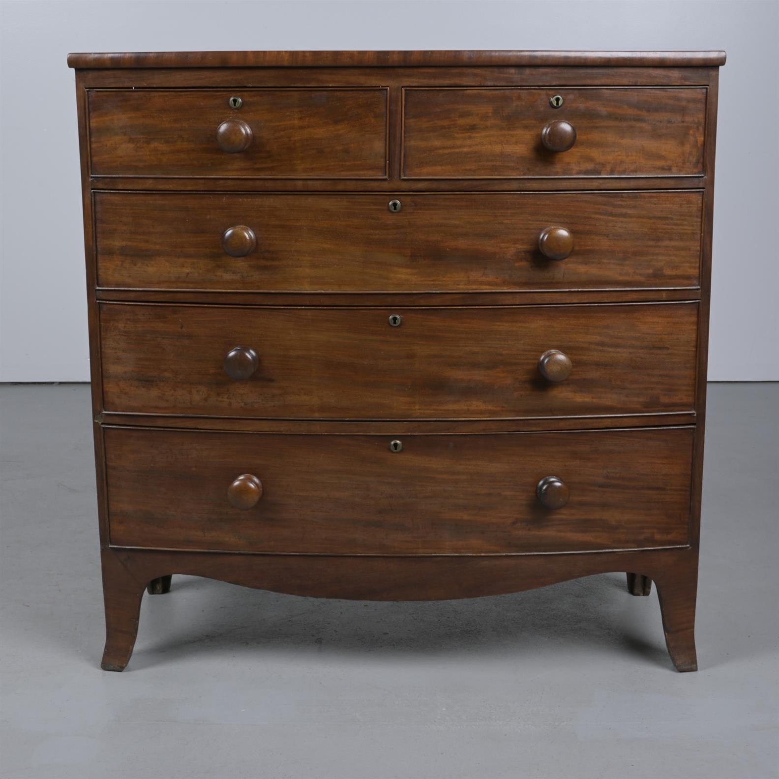 A LATE GEORGE III MAHOGANY BOW-FRONTED CHEST OF DRAWERS (105CM H X 104CM W X 51CM D)