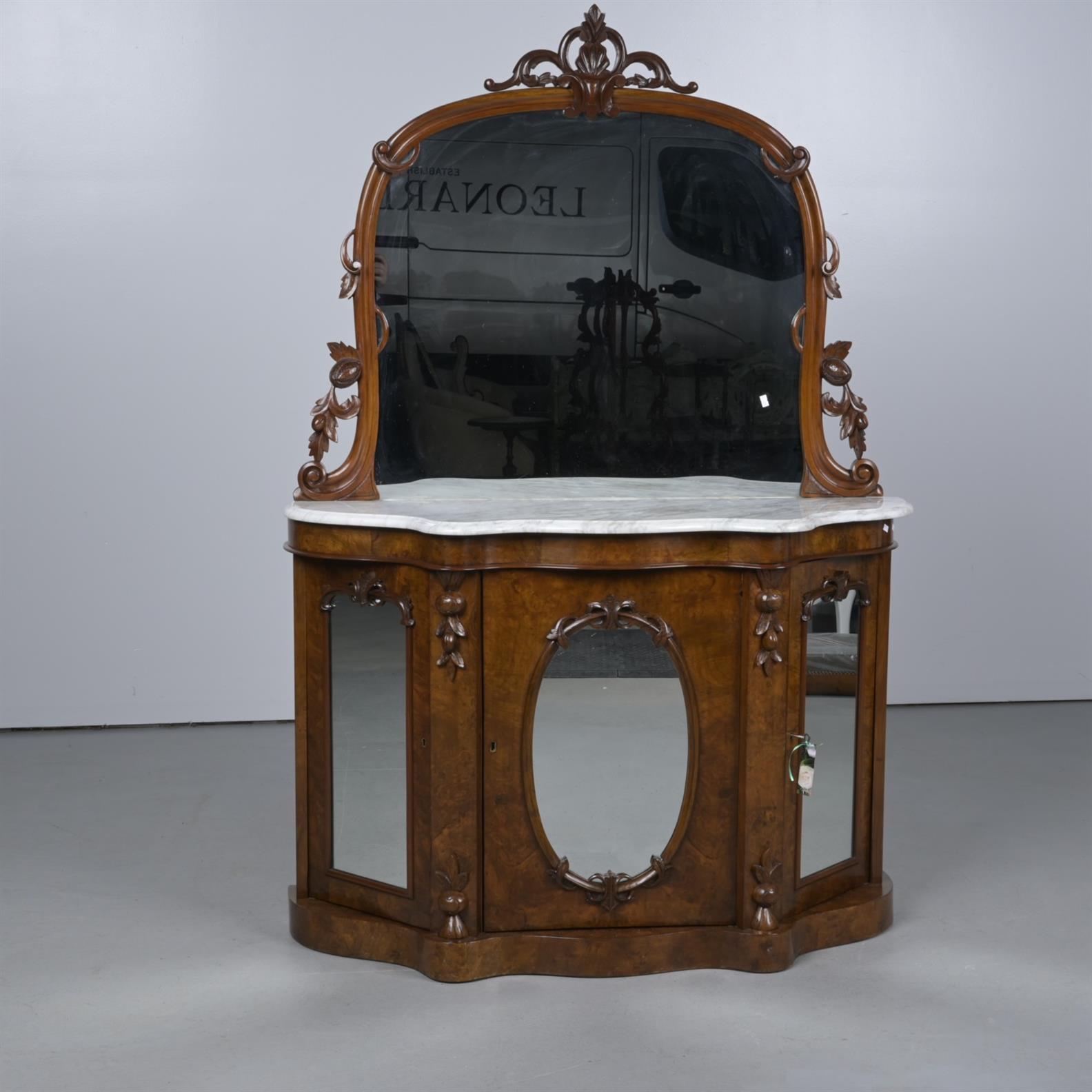 A VICTORIAN FIGURED WALNUT SIDE CABINET, WITH MARBLE TOP AND MIRRORED BACK AND DOORS (180CM H X 123CM W X 43CM D)