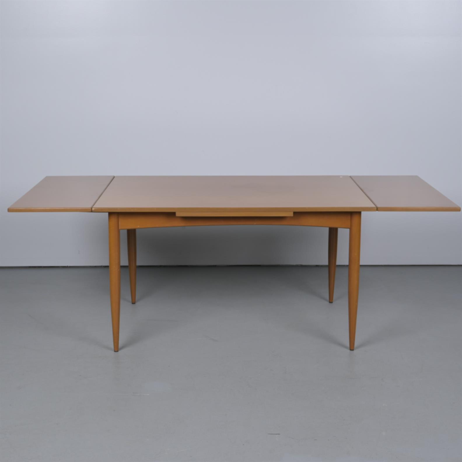 A MID-20th CENTURY LAMINATE EXTENDING DINING TABLE (75CM H X 214CM W X 91CM D, EXTENDED)