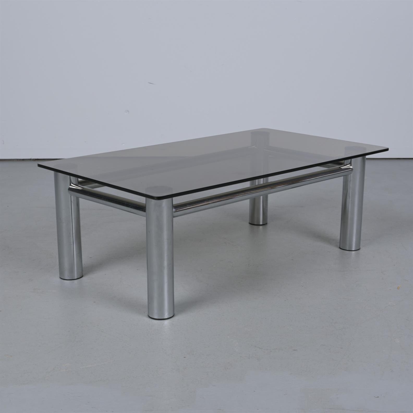 A MODERN CHROME AND SMOKE GLASS COFFEE TABLE (38CM H X 107CM W X 61CM D)
