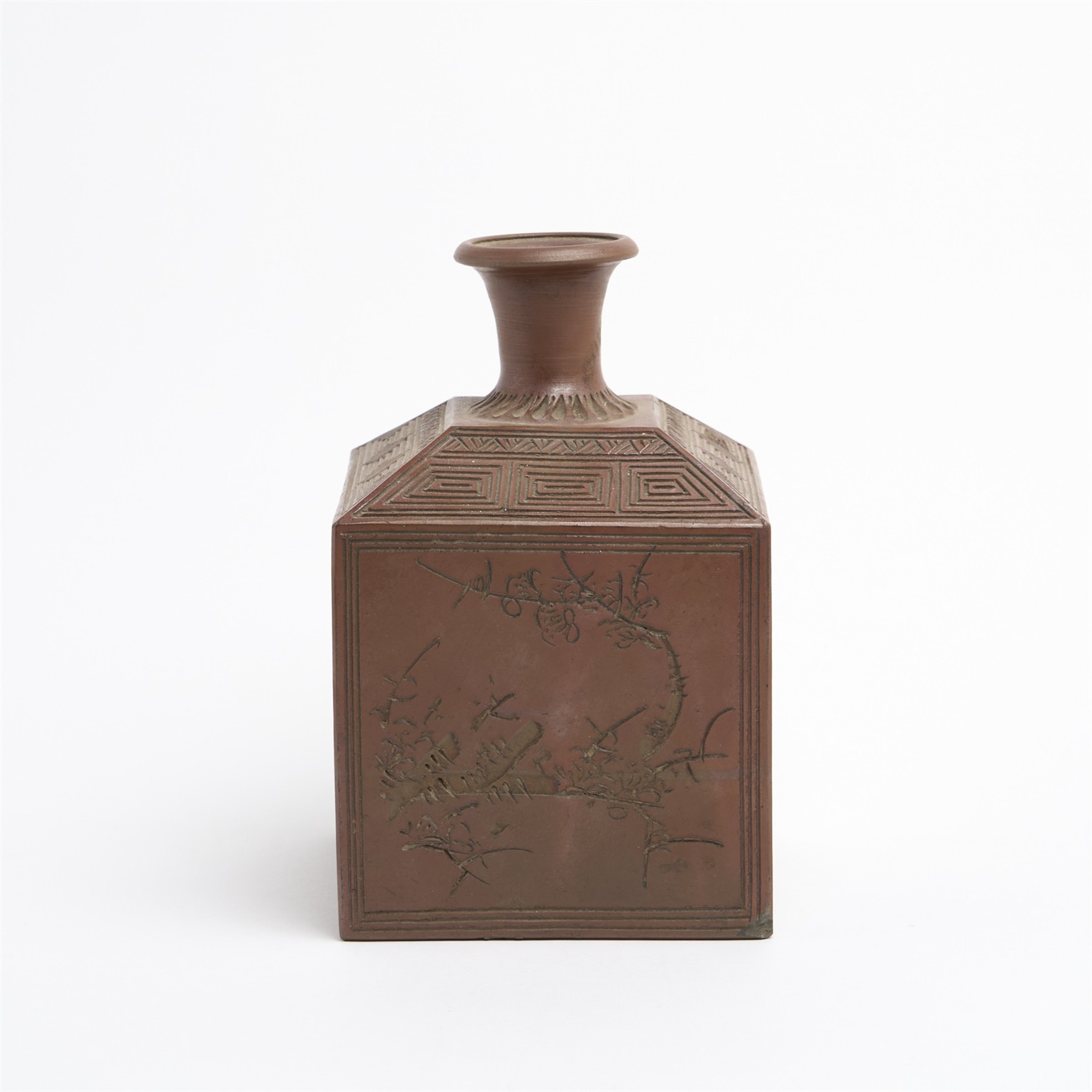 A CHINESE TERRACOTTA SQUARE FORM FLASK WITH INCISED DECORATION H.21.5CM