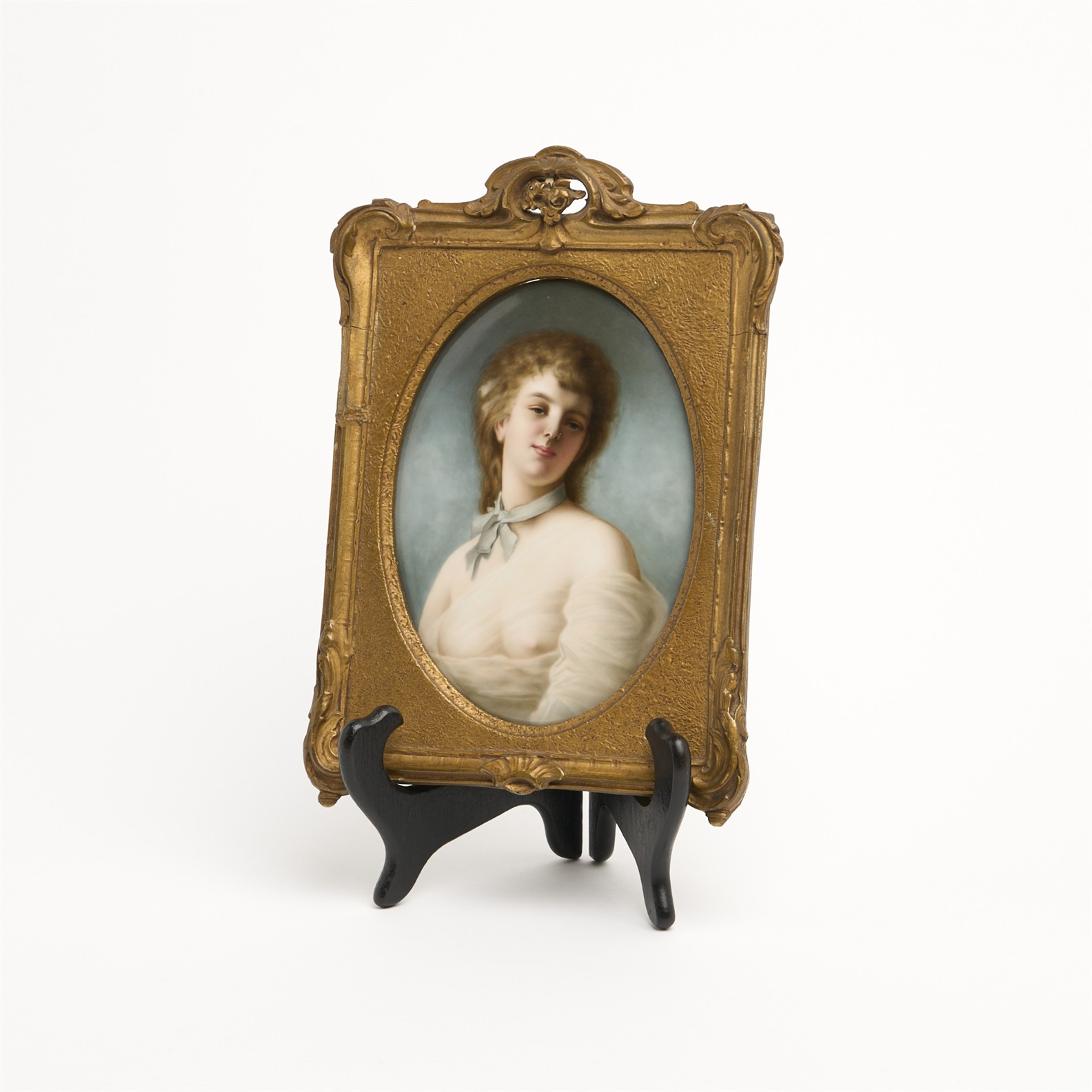 A GERMAN KPM PORCELAIN HAND PAINTED PLAQUE OF A YOUNG WOMAN IN A GILDED FRAME 25 X 17CM
