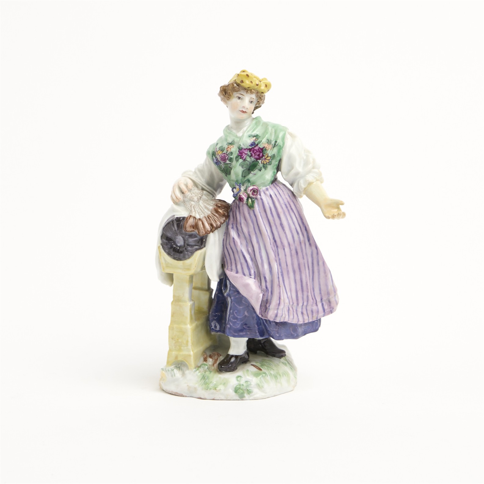 A MEISSEN PORCELAIN FIGURE OF A FEMALE VILLAGER H.14CM