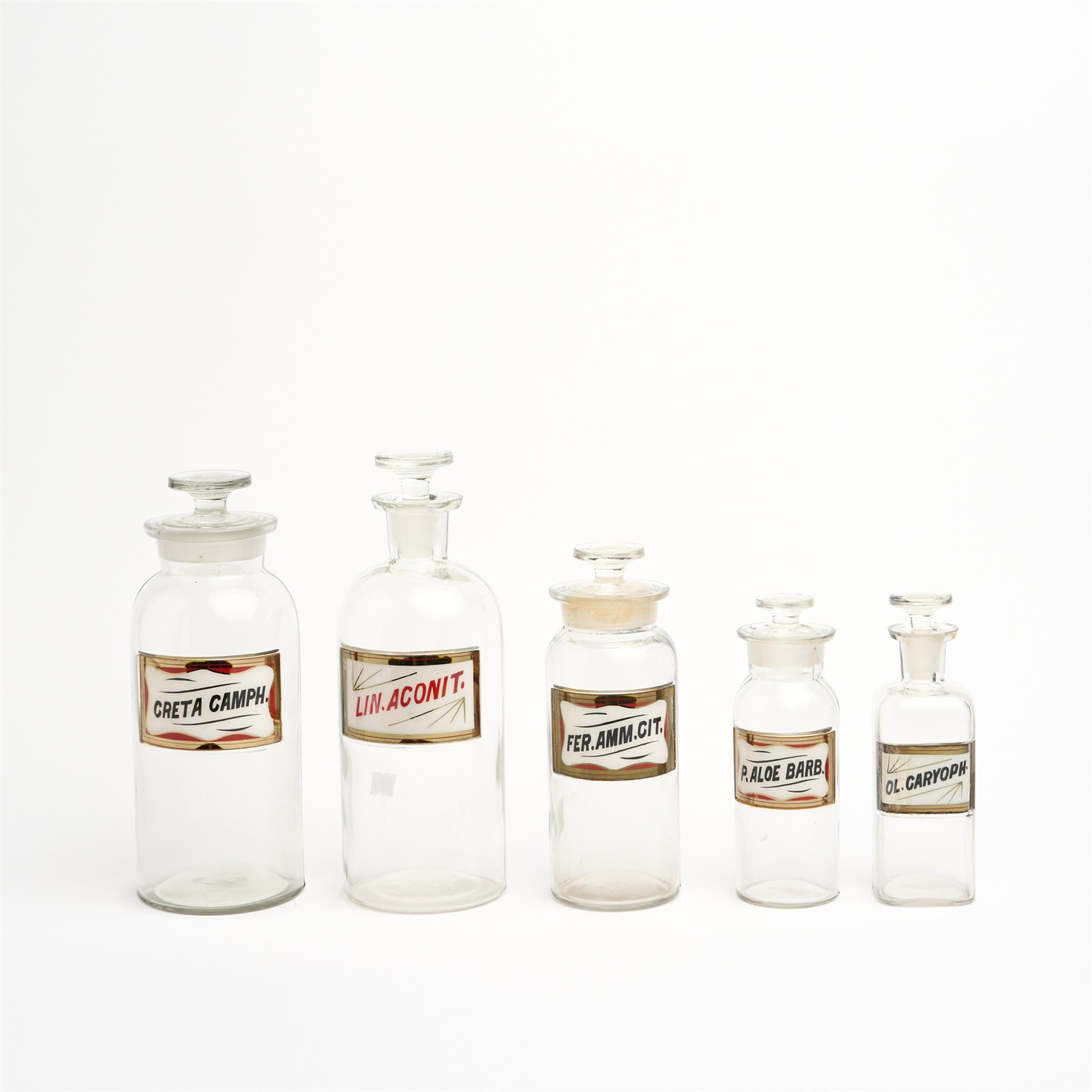 FIVE GLASS CHEMIST BOTTLES WITH HAND PAINTED GLASS LABELS (A/F) H.26CM