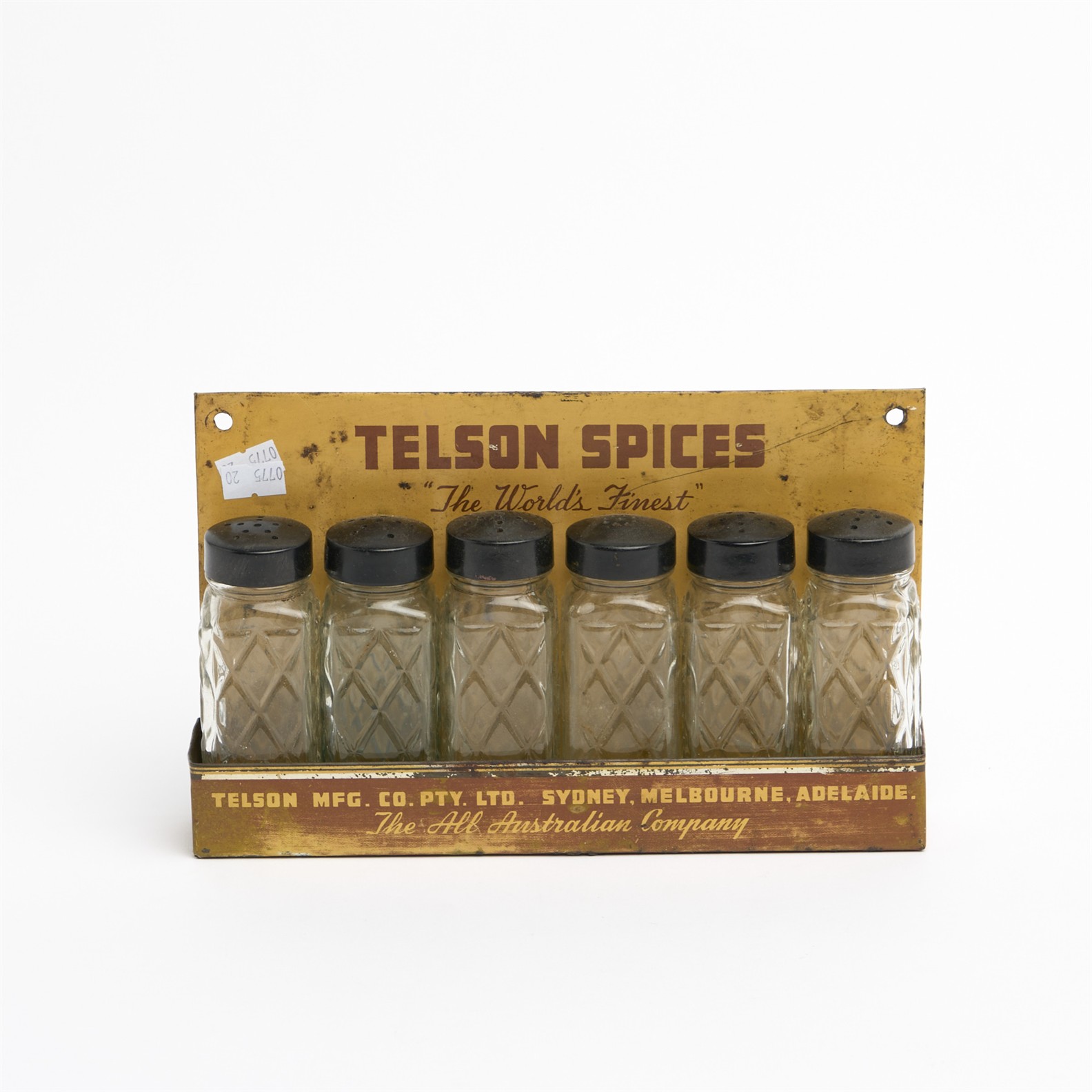 AN AUSTRALIAN TELSON SPICES SIX BOTTLE BAKELITE TOPPED DISPLAY STAND L.25CM