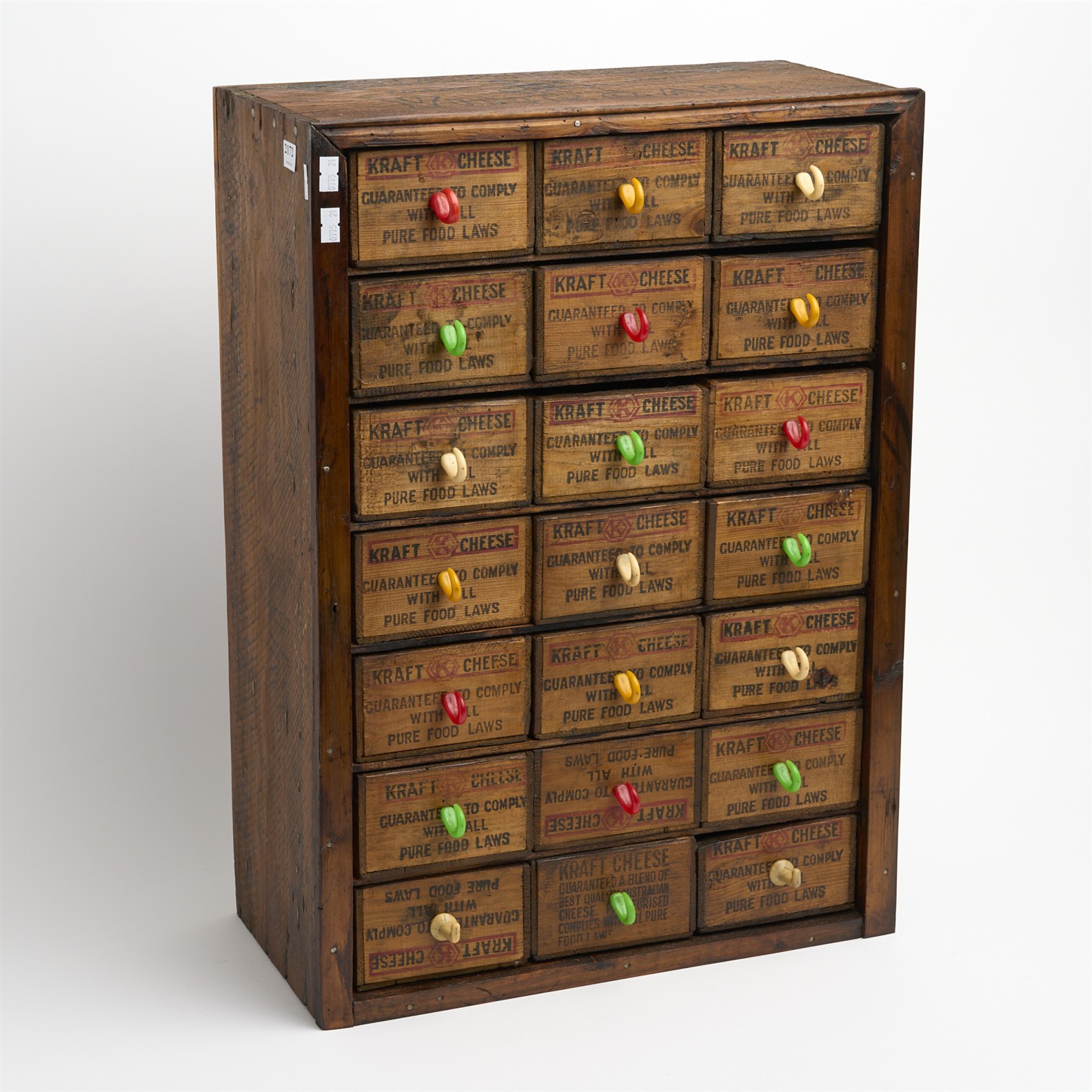AN AUSTRALIAN MADE CHAMPION VINEGAR AND CRAFT CHEESE 21 DRAWER PINE STORAGE CABINET WITH HARLEQUIN BAKELITE HANDLES H.60CM