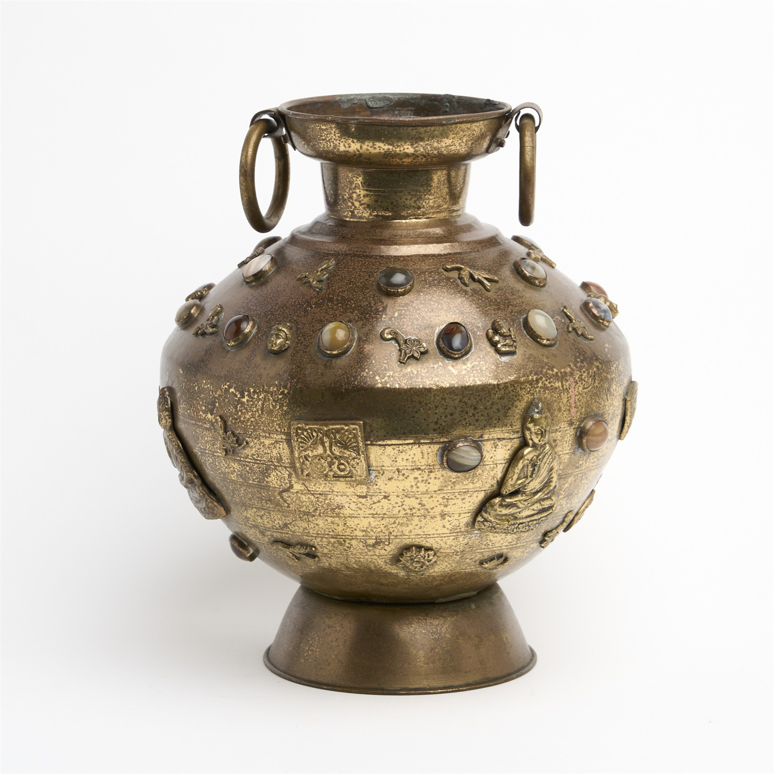 A BRASS TWIN HANDLED VASE INLAID WITH SEMI PRECIOUS STONES H.32CM
