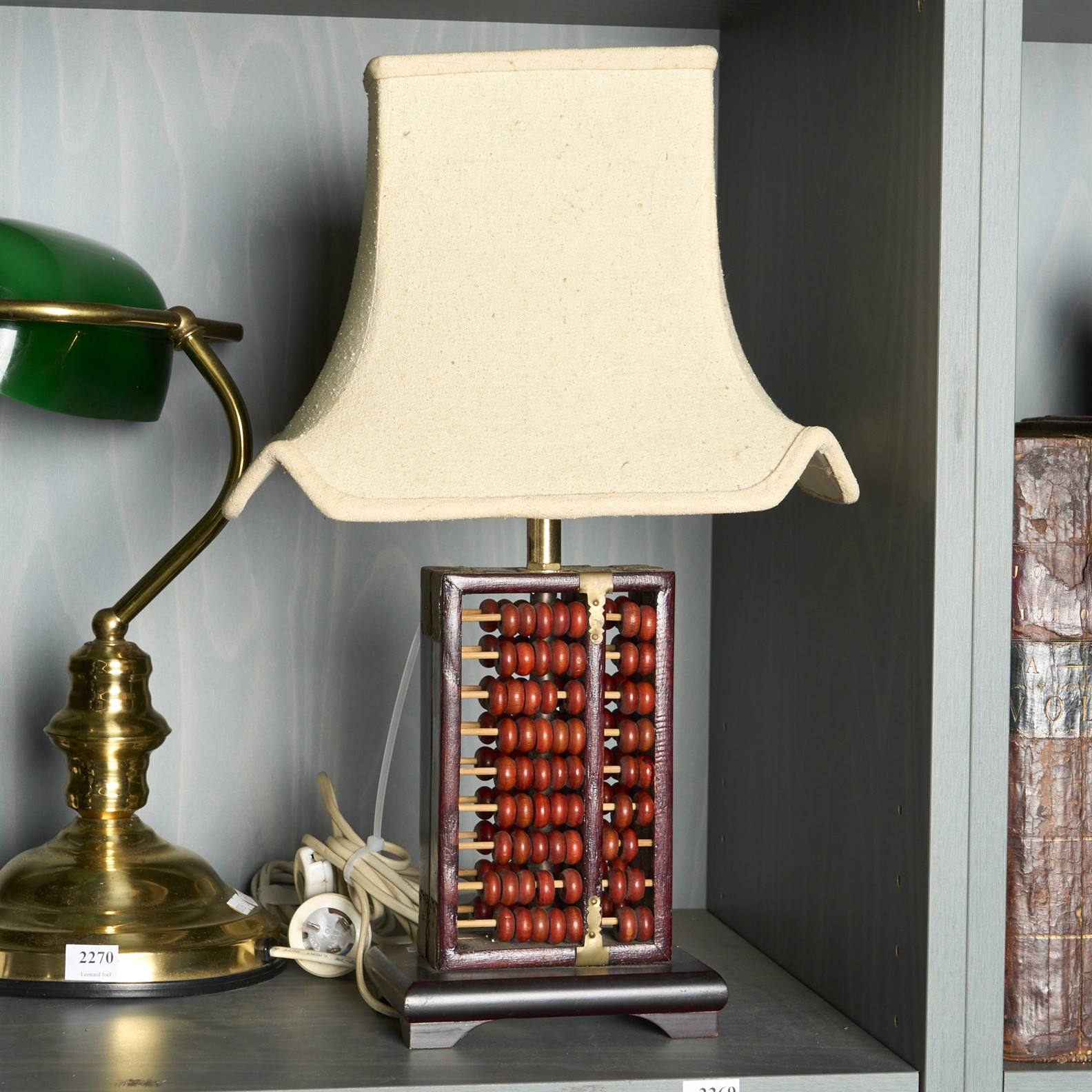 A MID-CENTURY CHINESE WOODEN DOUBLE ABACUS TELESCOPIC SHADE TABLE LAMP H.45CM