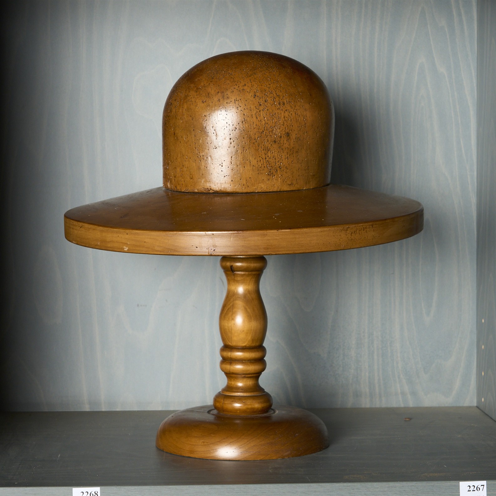 AN AUSTRALIAN PINE BROAD BRIMMED HAT BLOCK ON ORIGINAL BASE BY W A THORSBAIRD L.38CM