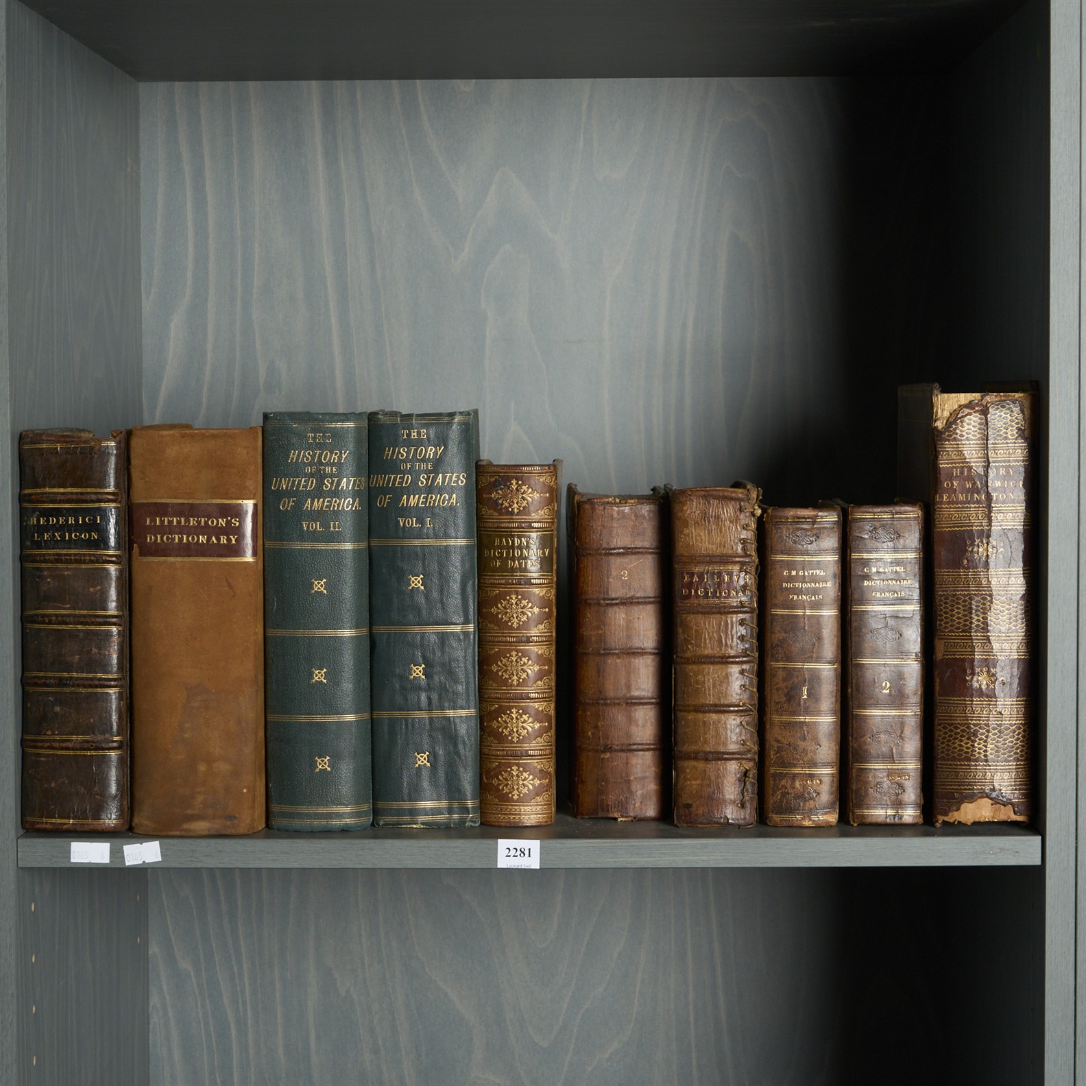 A SHELF OF ANTIQUE AND VINTAGE BOOKS INCLUDING DICTIONARIES