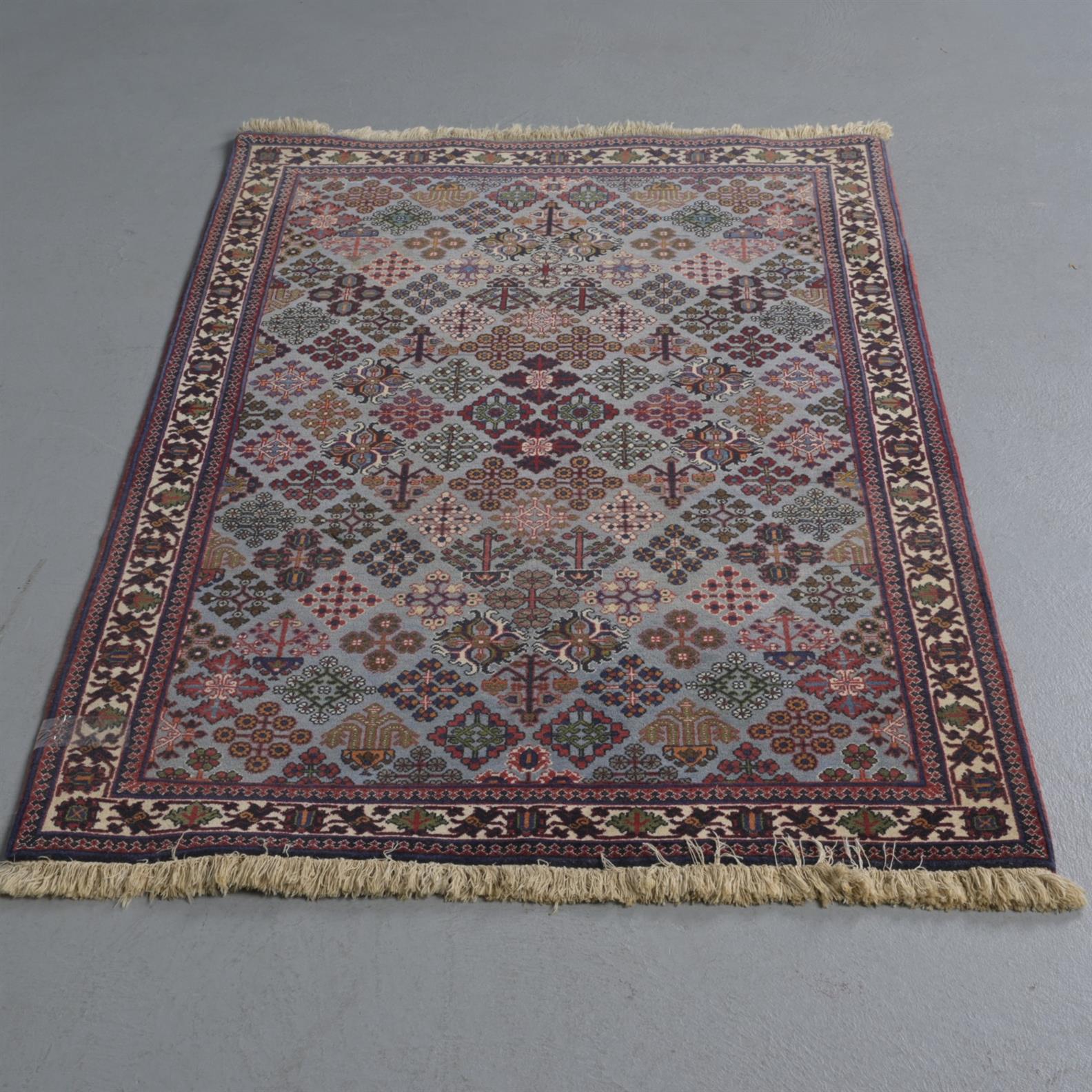 A PERSIAN DESIGN RUG WITH GEOMETRIC PATTERN ON RED AND BLUE FIELD (172CM X 106 CM)