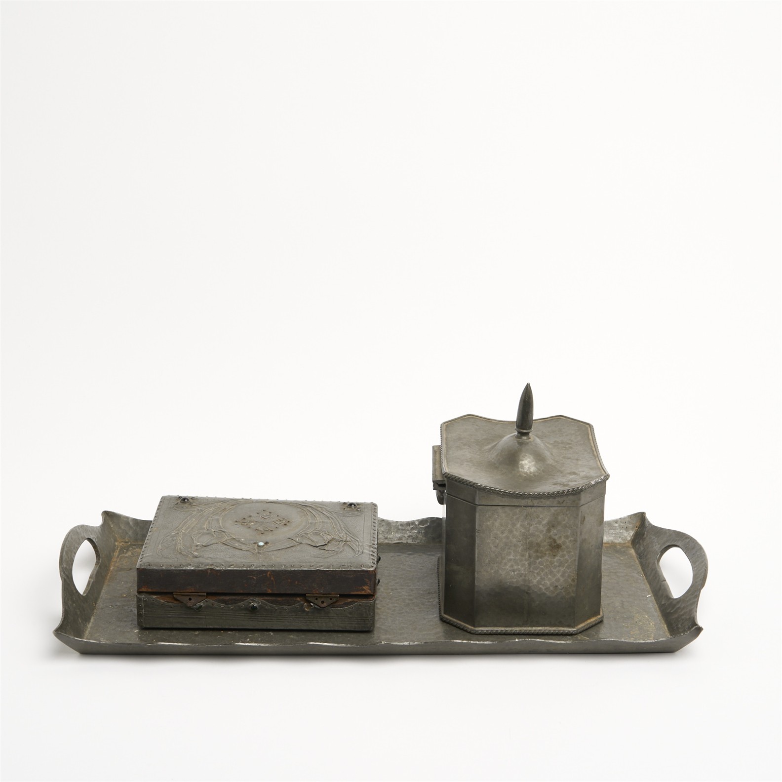 TWO EARLY 20TH CENTURY PIECES OF ENGLISH PEWTER INCLUDING A HAND BEATEN BATTLE AXE TRAY, A MANOR PERIOD SHEFFIELD TEA CADDY, AN D A PEWTER LINED CABOCHON INSET JEWELLERY BOX (A/F) L.47CM