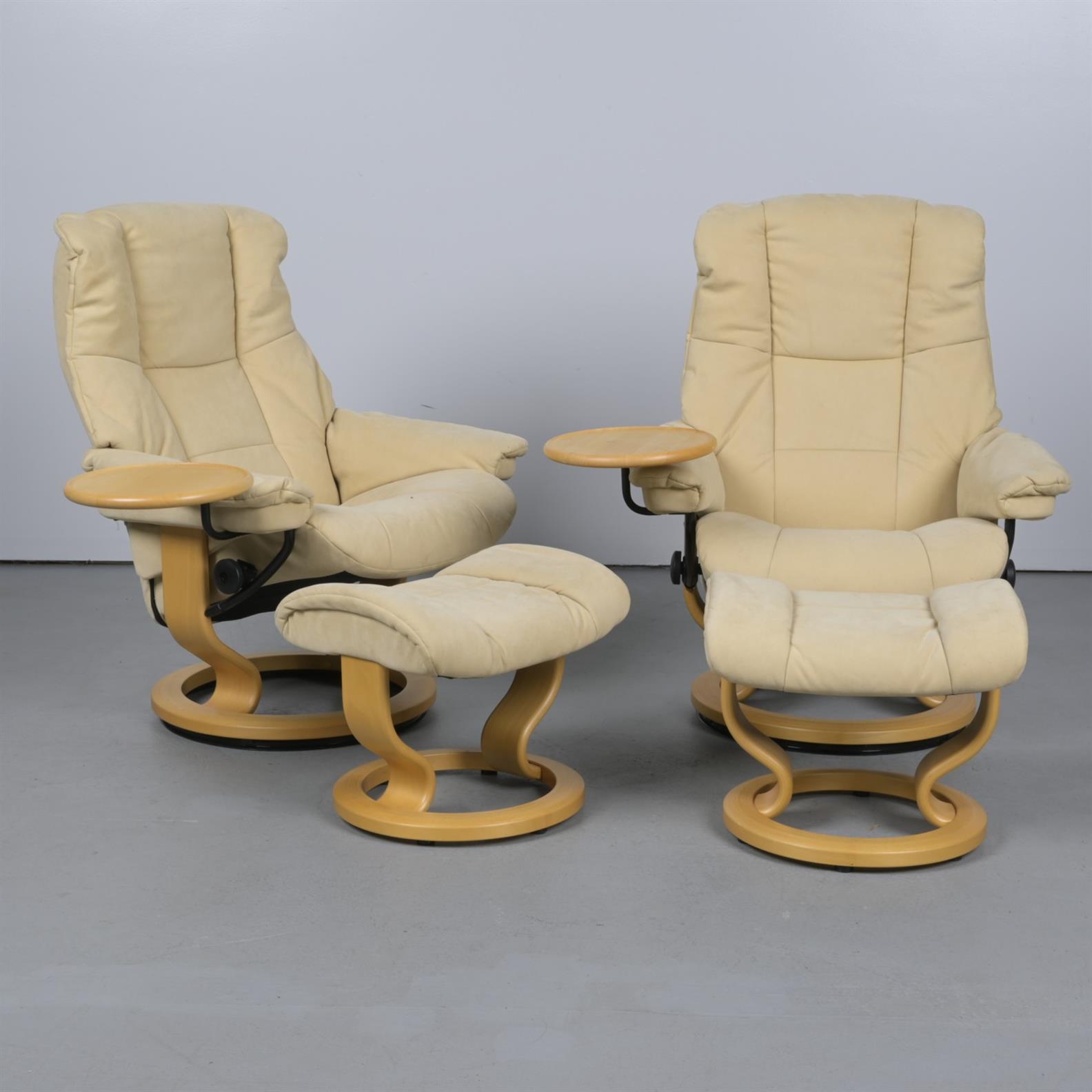 A PAIR OF 'STRESSLESS' UPHOLSTERED ARMCHAIRS, MADE IN NORWAY (102CM H X 82CM W X 93CM D)