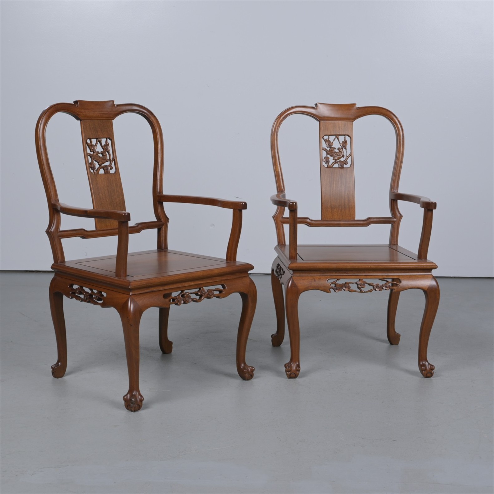 A PAIR OF CHINESE HARDWOOD ARMCHAIRS (96CM H X 59CM W X 55CM D)