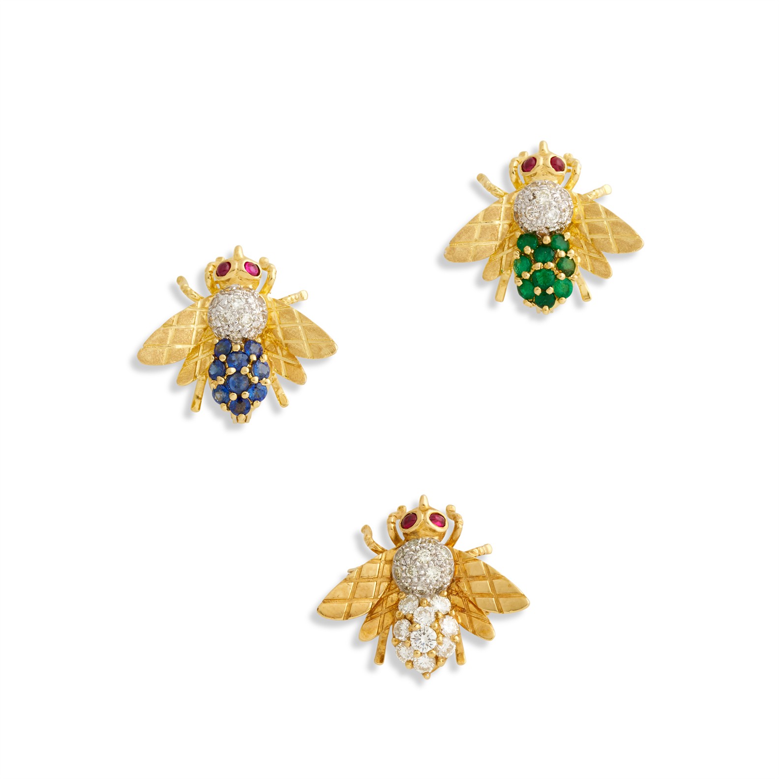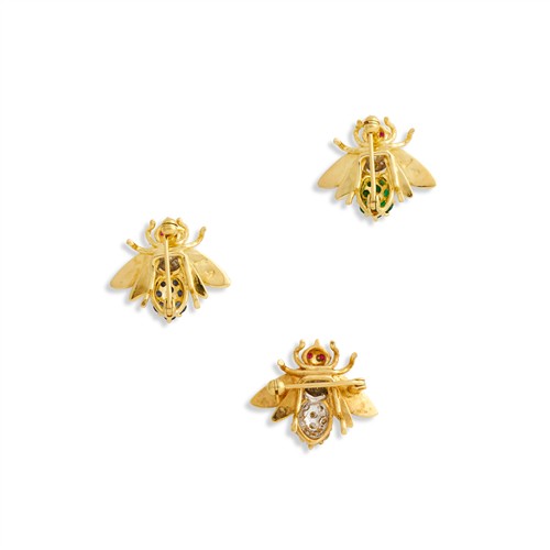 Each modelled as a bee, their thoraxes pavé-set with brilliant-cut diamonds, their abdomens claw-set with sapphires, diamonds and emeralds, to gem-set eyes and textured wings, mounted in18ct gold, length 22mm, width 24mm, gross weight approximately 15.9 grams.
