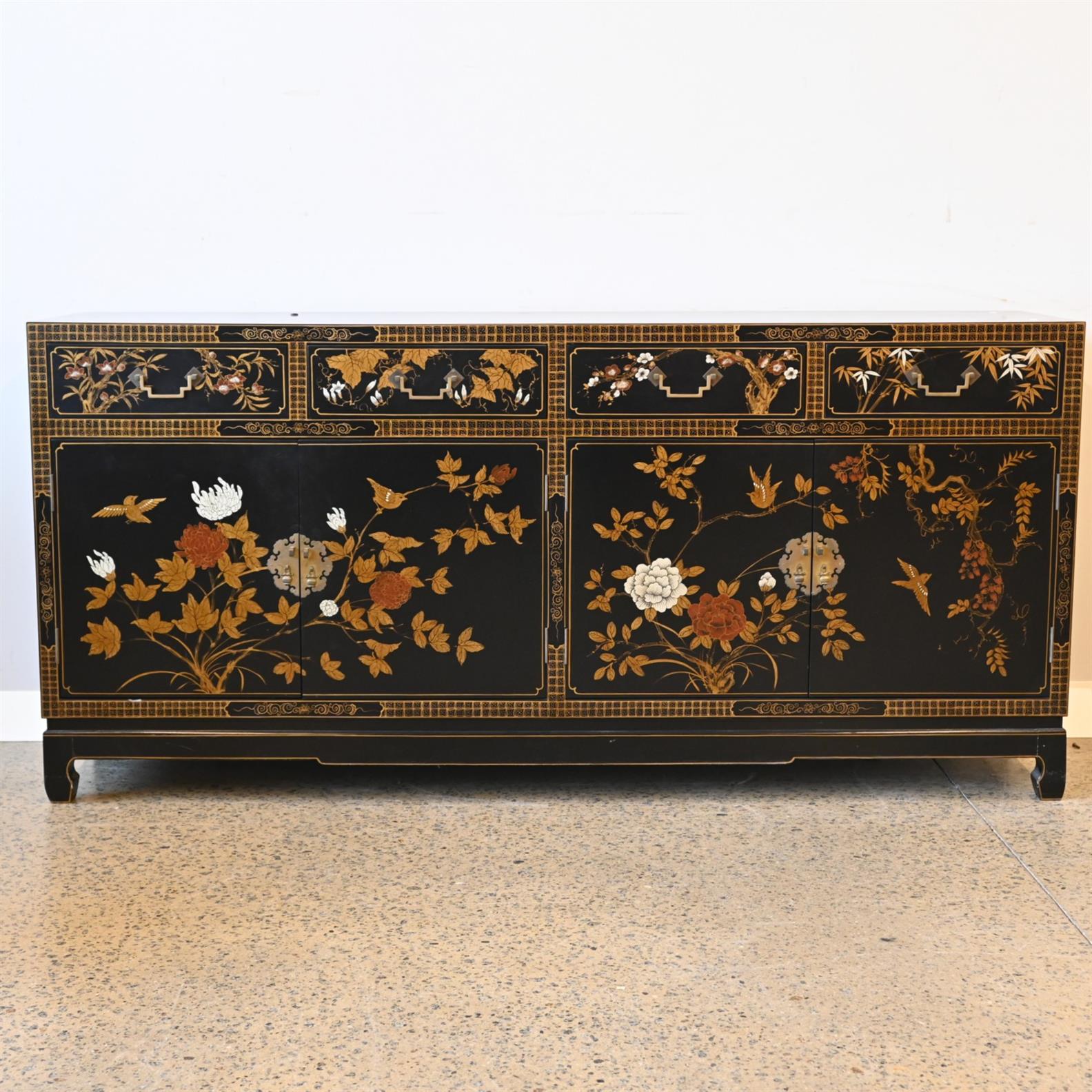 A CHINESE LACQUERED SIDEBOARD (86CM H X 183CM W X 46CM D)