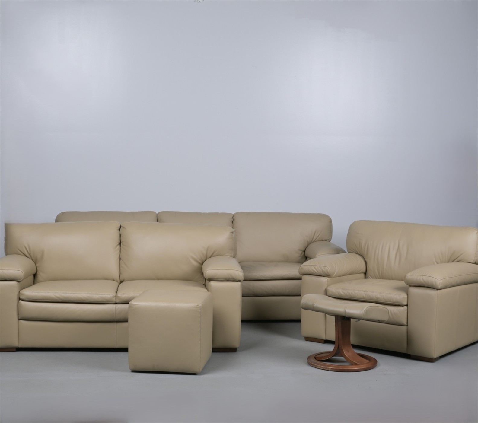 A LARGE LEATHER SUITE BY IMG, NORWAY, COMPRISING A THREE -SEAT SOFA, TWO-SEAT SOFA AND AN ARMCHIAR WITH A FOOTSTOOL TOGETHER WITH ANOTHER (83CM H X 236CM W X 90CM D, LARGEST)