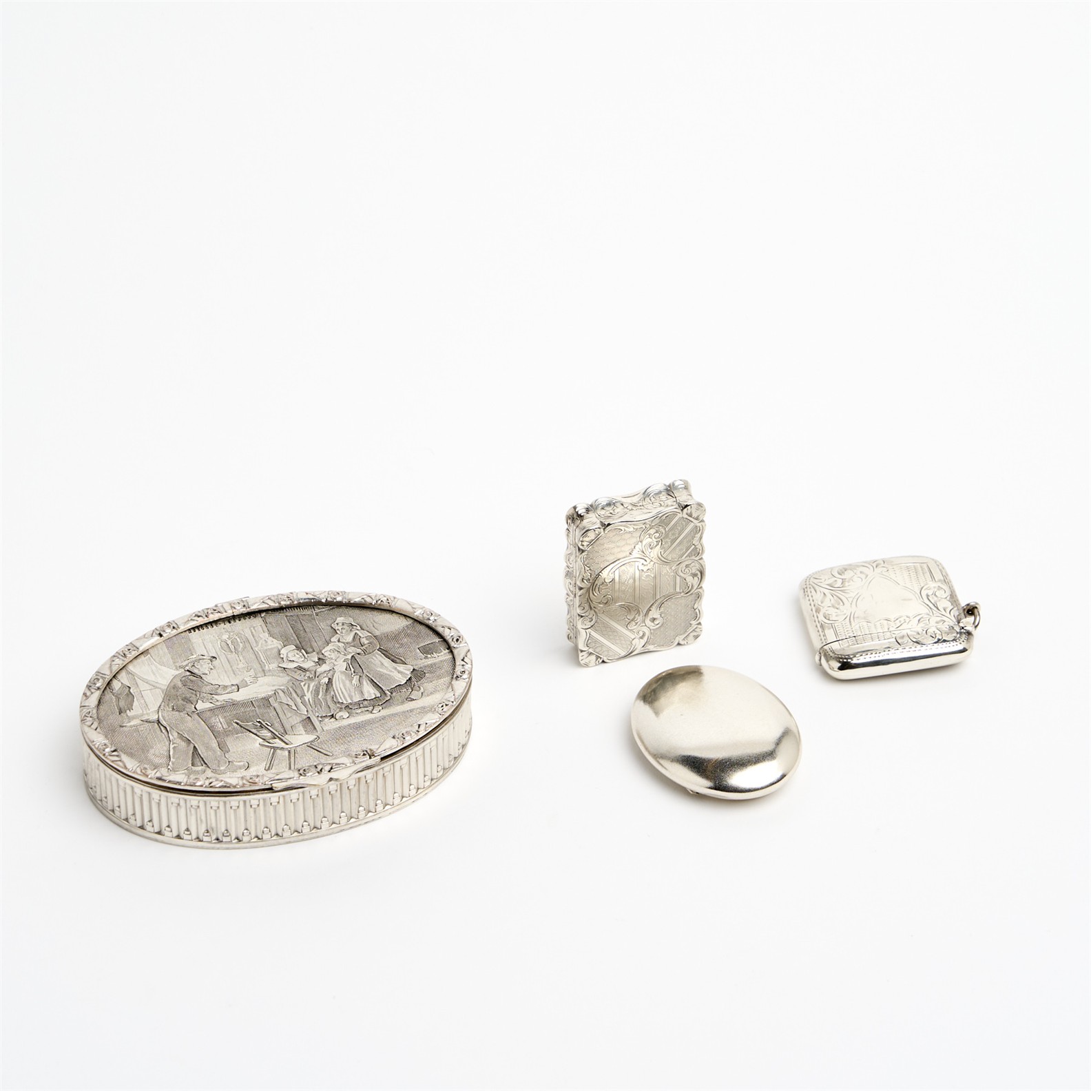 A VICTORIAN STERLING SILVER VINAIGRETTE, A STERLING SILVER VESTA CASE AND A 900 SILVER CIRCULAR BOX, TOTAL WEIGHT 86G
