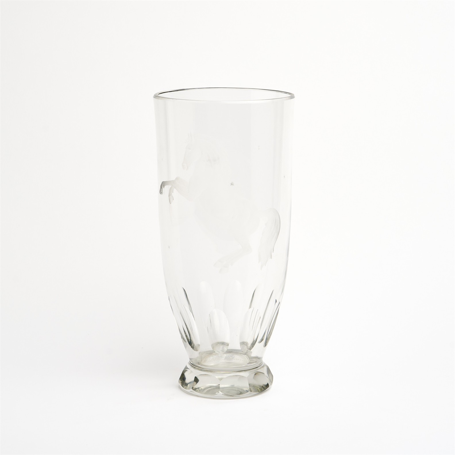 AN ORREFORS VASE WITH ETCHED STALLION DECORATION H.29CM