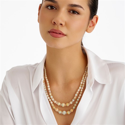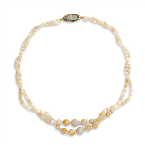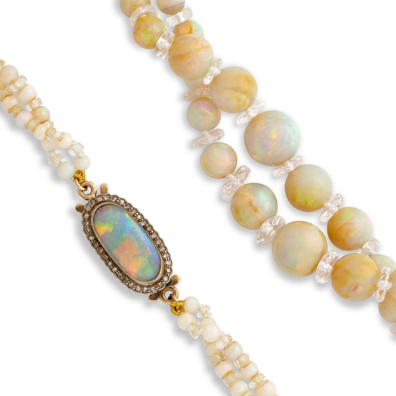 Composed as a double row of graduating opal beads measuring 11.3mm to 3.8mm, interspersed with faceted rock crystal rondelles, completed by an 14ct gold opal and diamond clasp, inner circumference 500mm, gross weight approximately 42.8 grams.