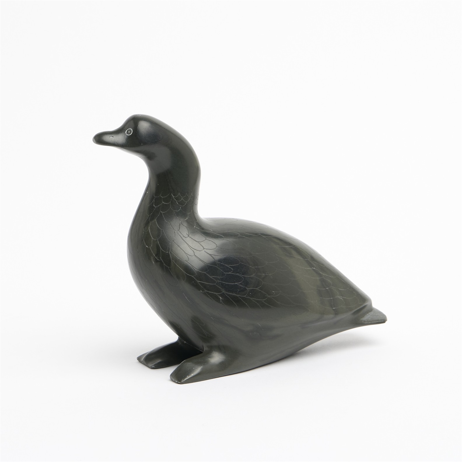 AN INUIT CARVED BLACK STONE DUCK, SIGNED ILLEGIBLE TO BASE H.16.5CM