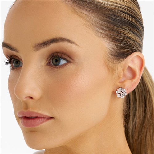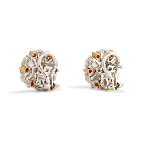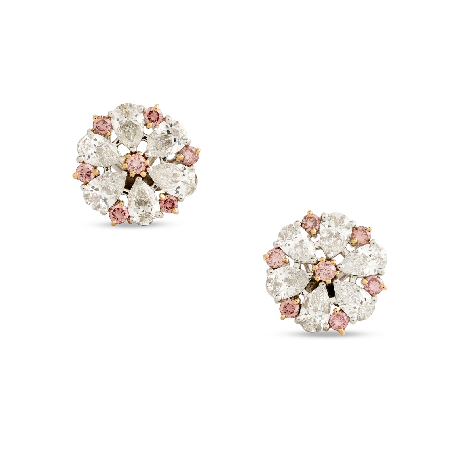 Each of floral design, centring a claw-set fancy pink brilliant-cut diamond to petals claw-set with pear-shaped diamonds, interspersed with similarly set fancy pink diamonds, the fancy pink diamonds and near colourless diamonds together weighing approximately 0.40 carats and 2.45 carats respectively, mounted in platinum and 18ct rose gold, post and clip fittings, diameter 14mm, gross weight approximately 7.1 grams.