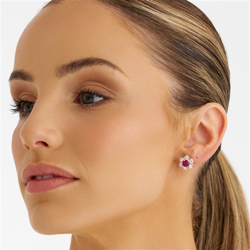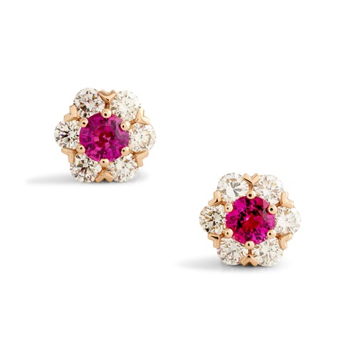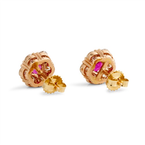 Each of cluster design, centring a claw-set circular-cut ruby weighing 1.07 carats and 1.06 carats respectively, within a frame of similarly set brilliant-cut diamonds, the diamonds together weighing approximately 2.40 carats mounted in 14ct gold, post and scroll fittings, gross weight approximately 4.8 grams.