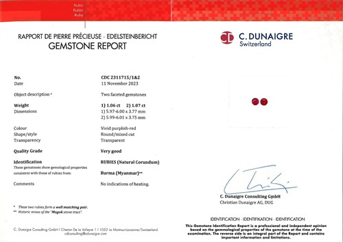 a fascimile C.Nunaigre Gemstone report numbered CDC 2311715/1&2 dated 11 November 2023, stating the rubies are together weighing 2.13 carats are natural, vivid purplish-red colour with no indications of heating, of Burmese origin;