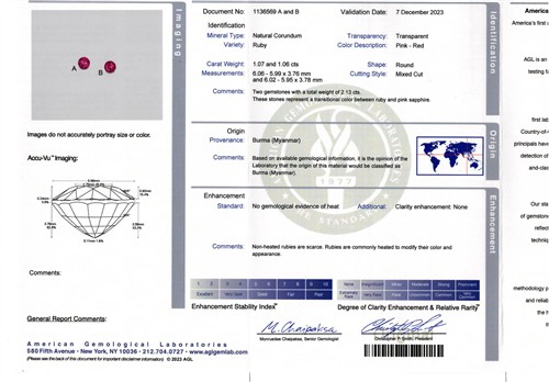 a fascimile AGL report numbered 1136569 A & B dated 07 December 2023, stating the 1.07 and 1.06 carat rubies are natural, pink - red colour with no gemological evidence of heat, of Burmese origin.