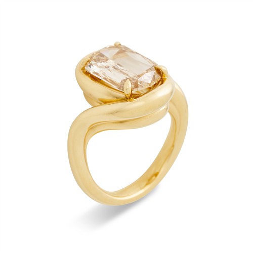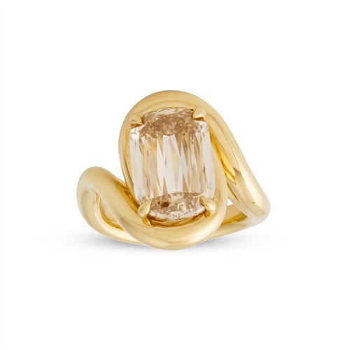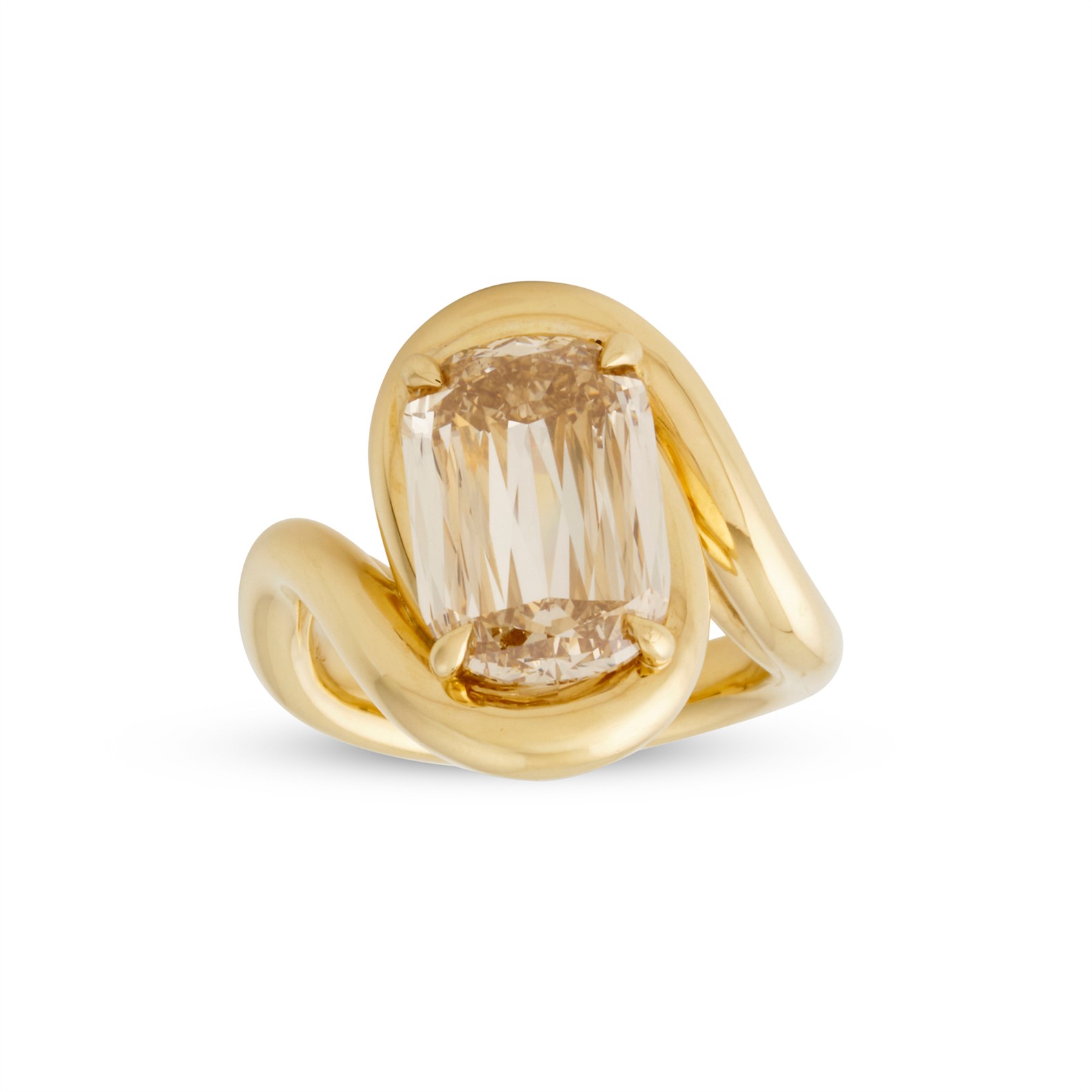 The fancy yellow-brown modified rectangular brilliant-cut diamond weighing 5.16 carats is claw-set, within a undulating surround, mounted in 18ct gold, size M, gross weight approximately 18.6 grams.