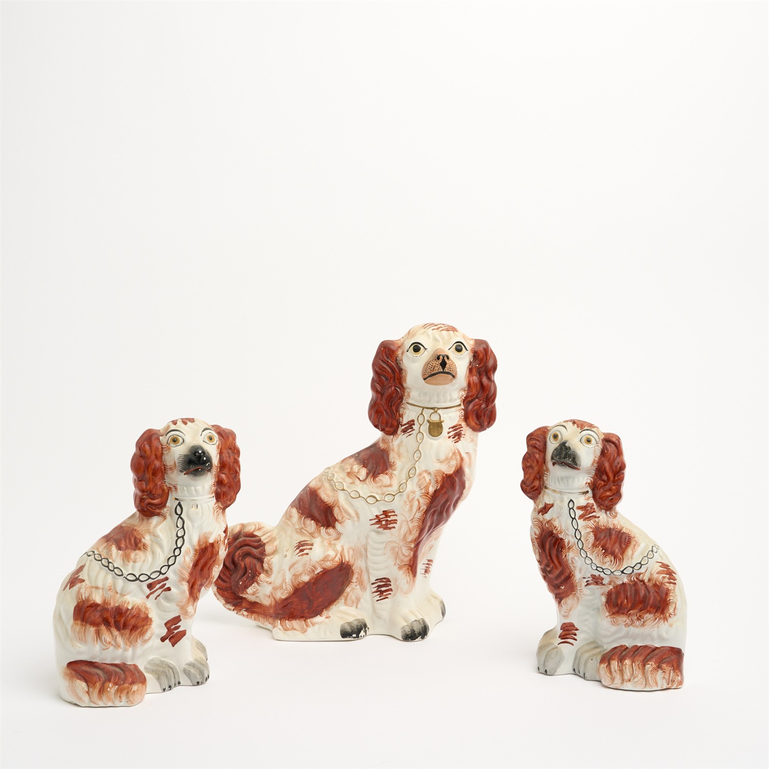 THREE STAFFORDSHIRE SPANIELS INCLUDING AN OPPOSED PAIR H.33CM (TALLEST) (A/F)