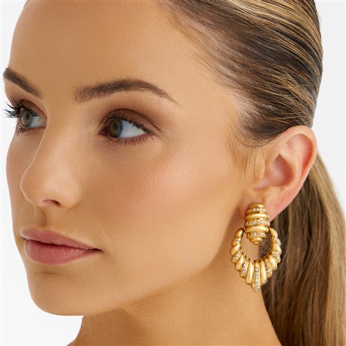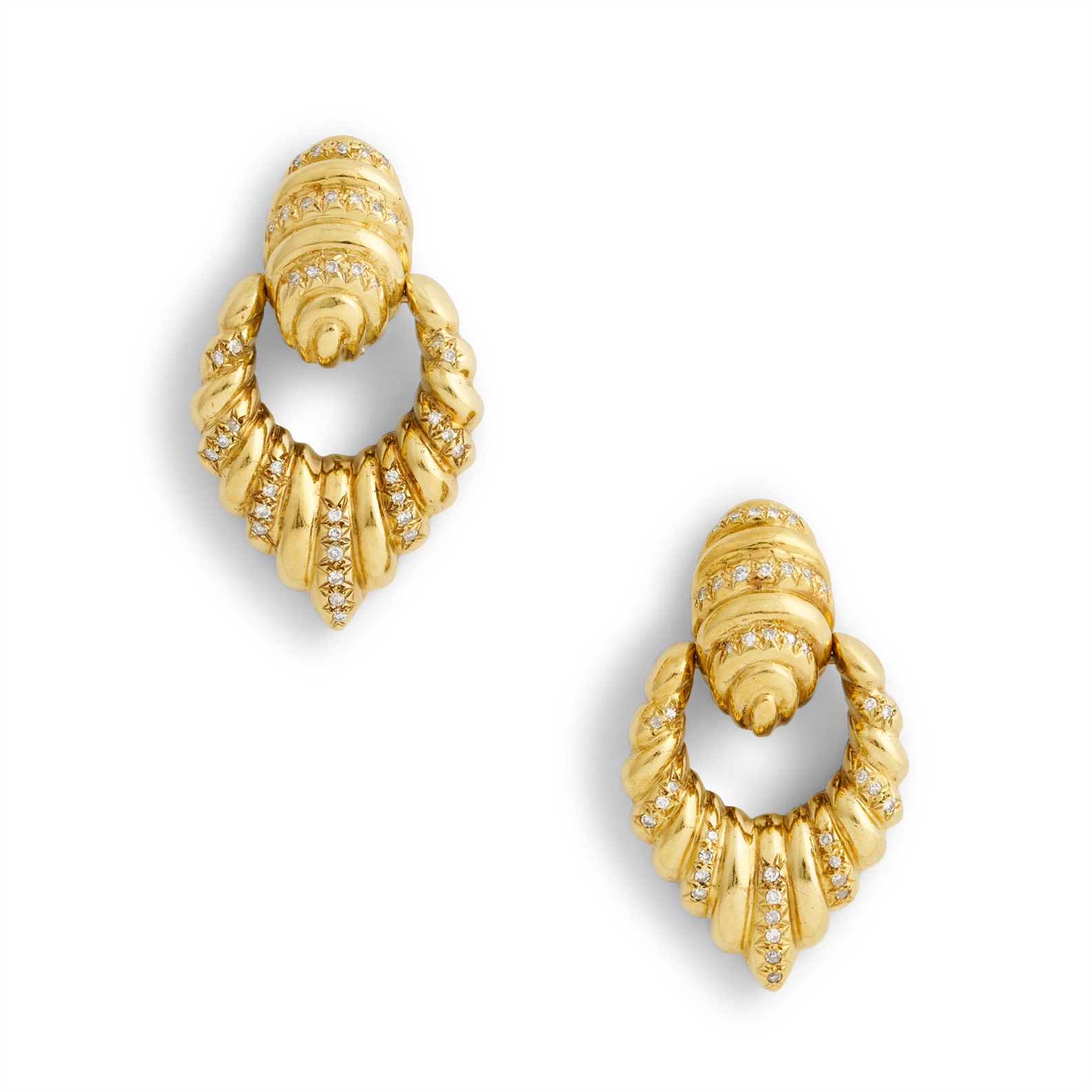 Each of doorknocker design, pavé-set with single-cut diamonds, the diamonds together weighing approximately 1.00 carats, mounted in 18ct gold, length 50mm, clip fittings, gross weight approximately 37.8 grams.