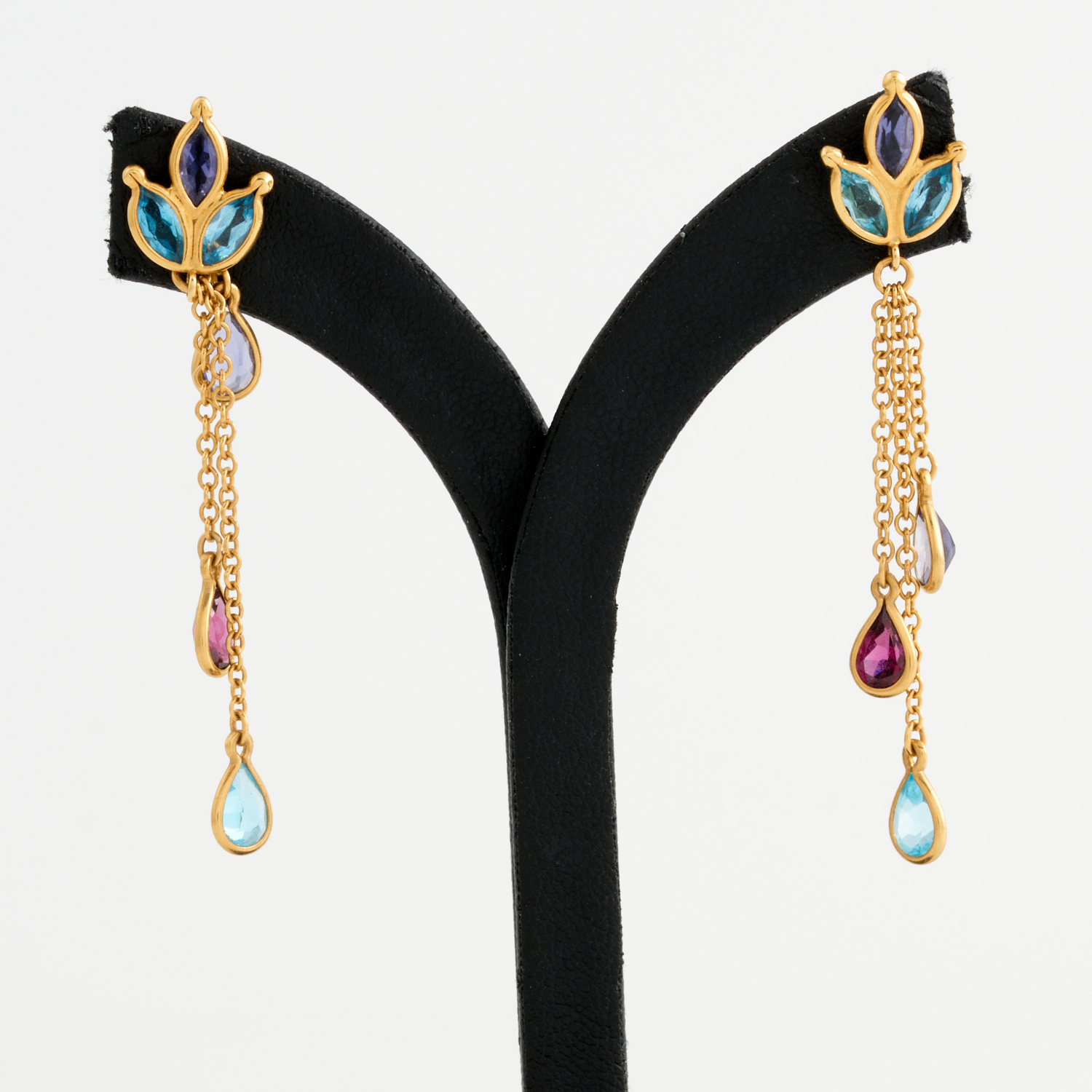 A PAIR OF MULTIGEM CHAIN EARRINGS IN 18CT GOLD TO POST AND BUTTERFLY FITTINGS, TOTAL LENGTH 55MM, TOTAL WEIGHT 3.7GMS