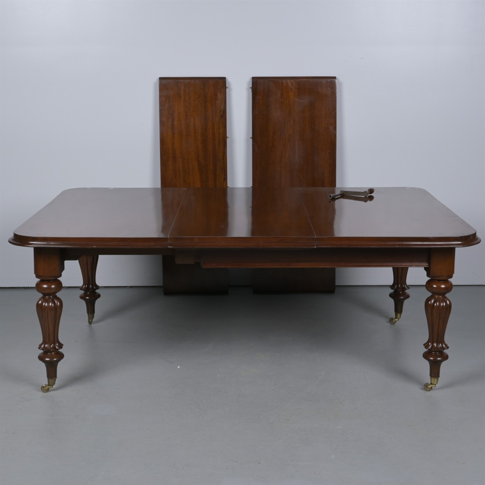 A VICTORIAN MAHOGANY EXTENDING DINING TABLE (76CM H X 139CM W X 136CM D)