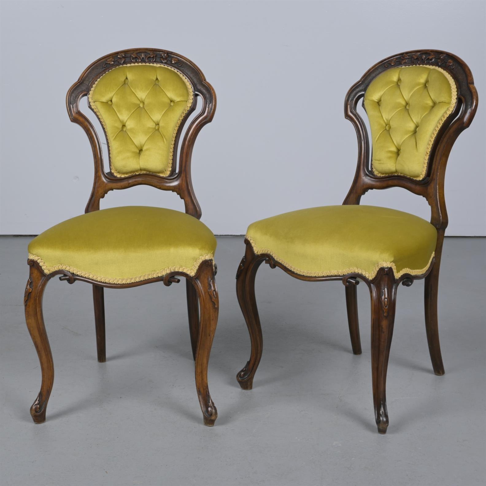 A PAIR OF VICTORIAN UPHOLSTERED SIDE CHAIRS (90CM H X 48CM W X 56CM D)