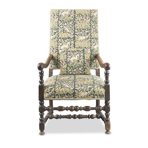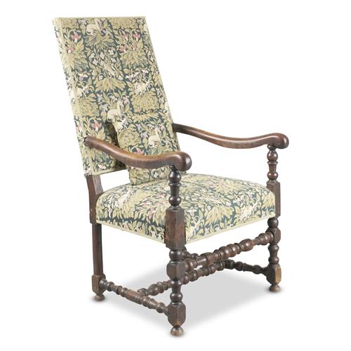 The tall raked square back and open arms above the upholstered seat on turned supports with H-form stretchers, in woven tapestry-style fabric