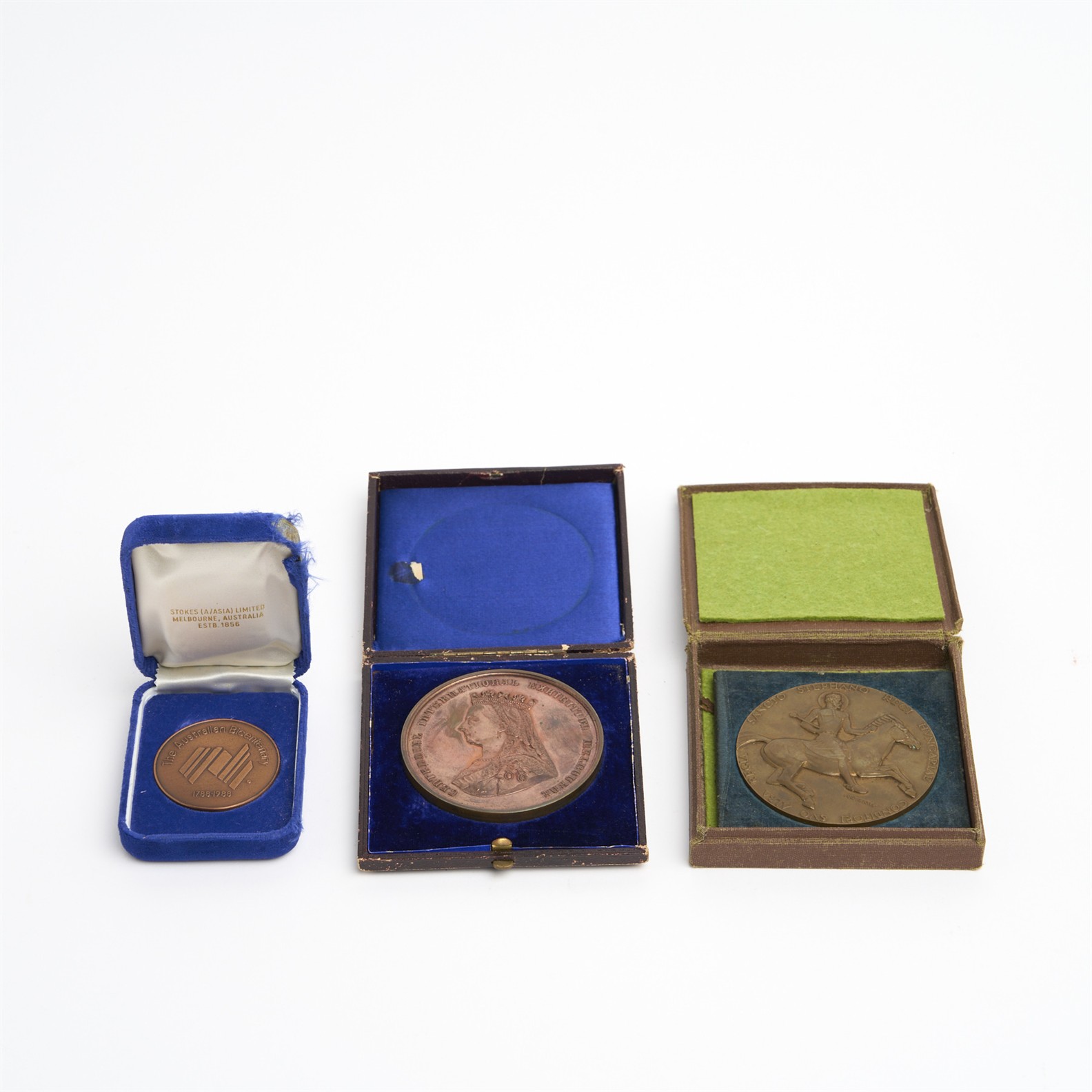 THREE MEDALS INCLUDING AN 1888 MELBOURNE CENTENARY EXHIBITION MEDAL, A 1988 BICENTENENNIAL MEDA, AND A HUNGARIAN MEDAL COMMEMORATING ST STEPHEN (SOME BOXES A/F)