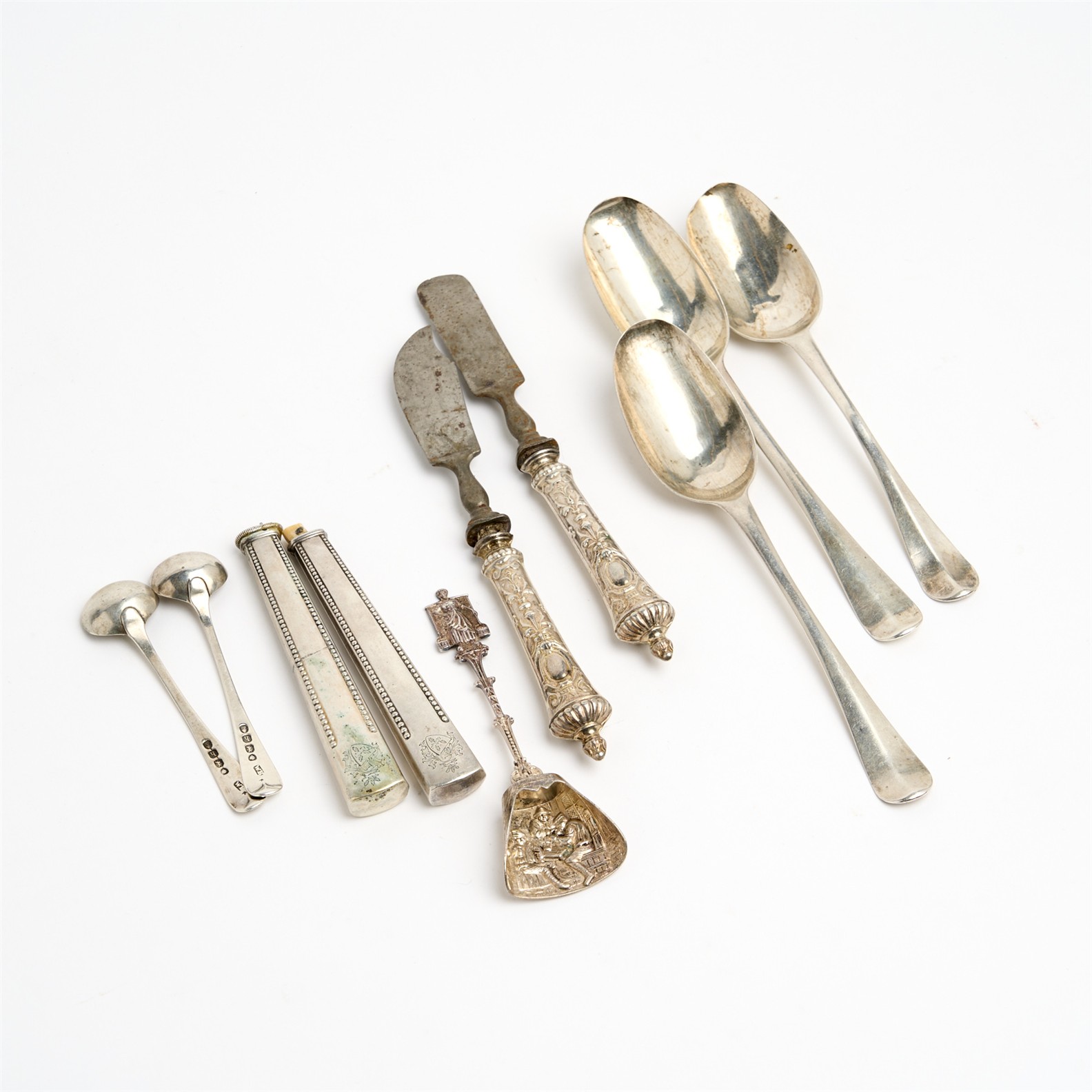 A GROUP OF ASSORTED ENGLISH AND CONTINENTAL SILVER, INCLUDING THREE GEORGIAN TABLE SPOONS, A PAIR OF MUSTARD SPOONS, AND VARIOUS CONTINENTAL PIECES (TOTAL STERLING WEIGHT 168g, PLUS CONTINENTAL PIECES)