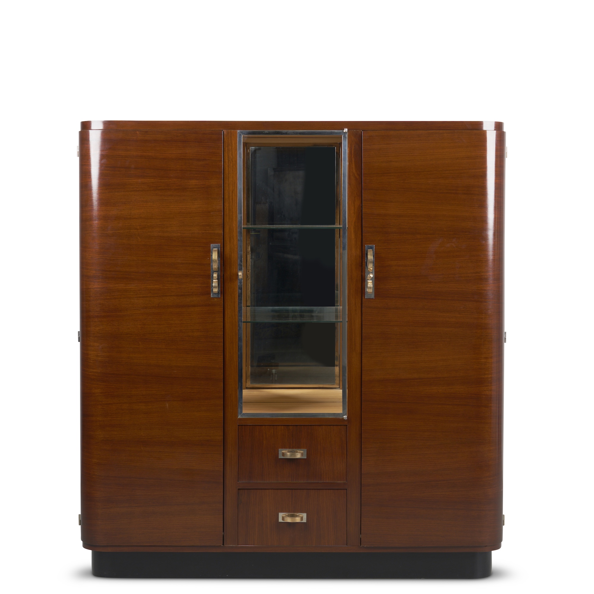 Of rounded rectangular outline, the recessed top above a central chromed metal-framed glazed door enclosing removable glass shelves with two drawers below, the outer doors enclosing adjustable shelves, on a recessed plinth base