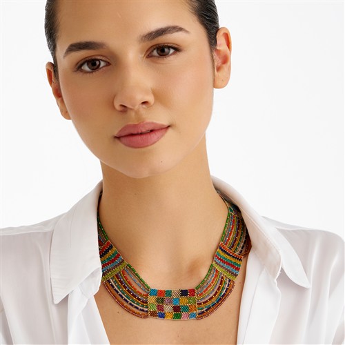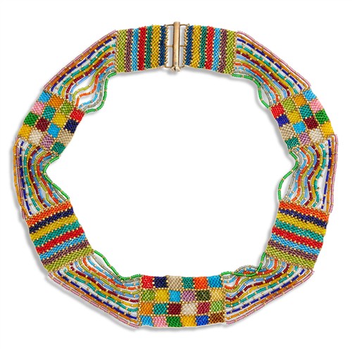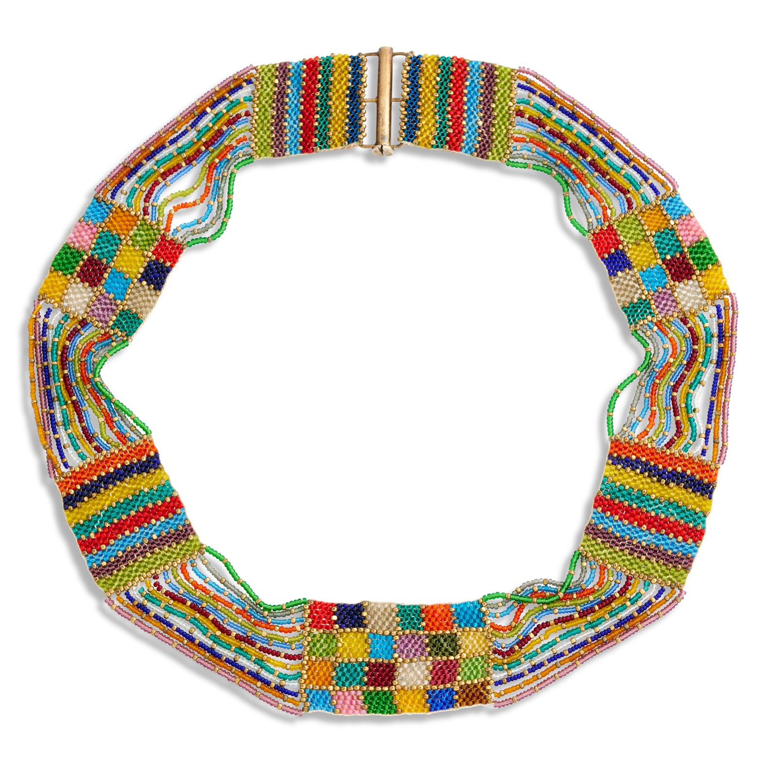 Modelled as a collar composed of 13 rows of multi-coloured glass beads, interspersed with sections of patchwork design, completed by a 9ct gold clasp, inner circumference 430mm, gross weight approximately 28.1 grams.