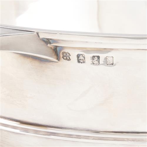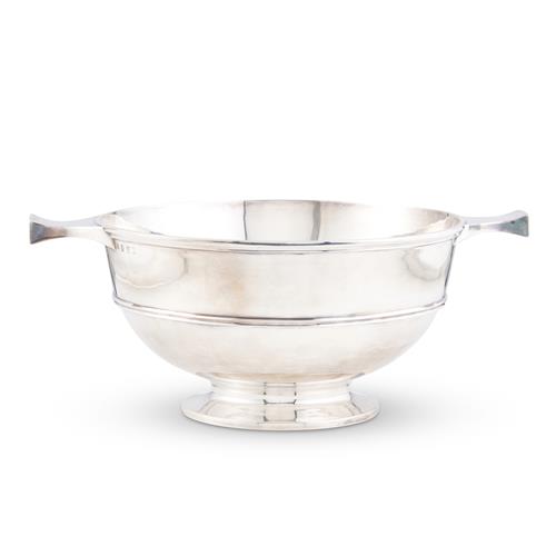 In the form of a quaich, circular with a pair of shaped handles to the rim, moulded lip and mid-height girdle, on a waisted circular foot