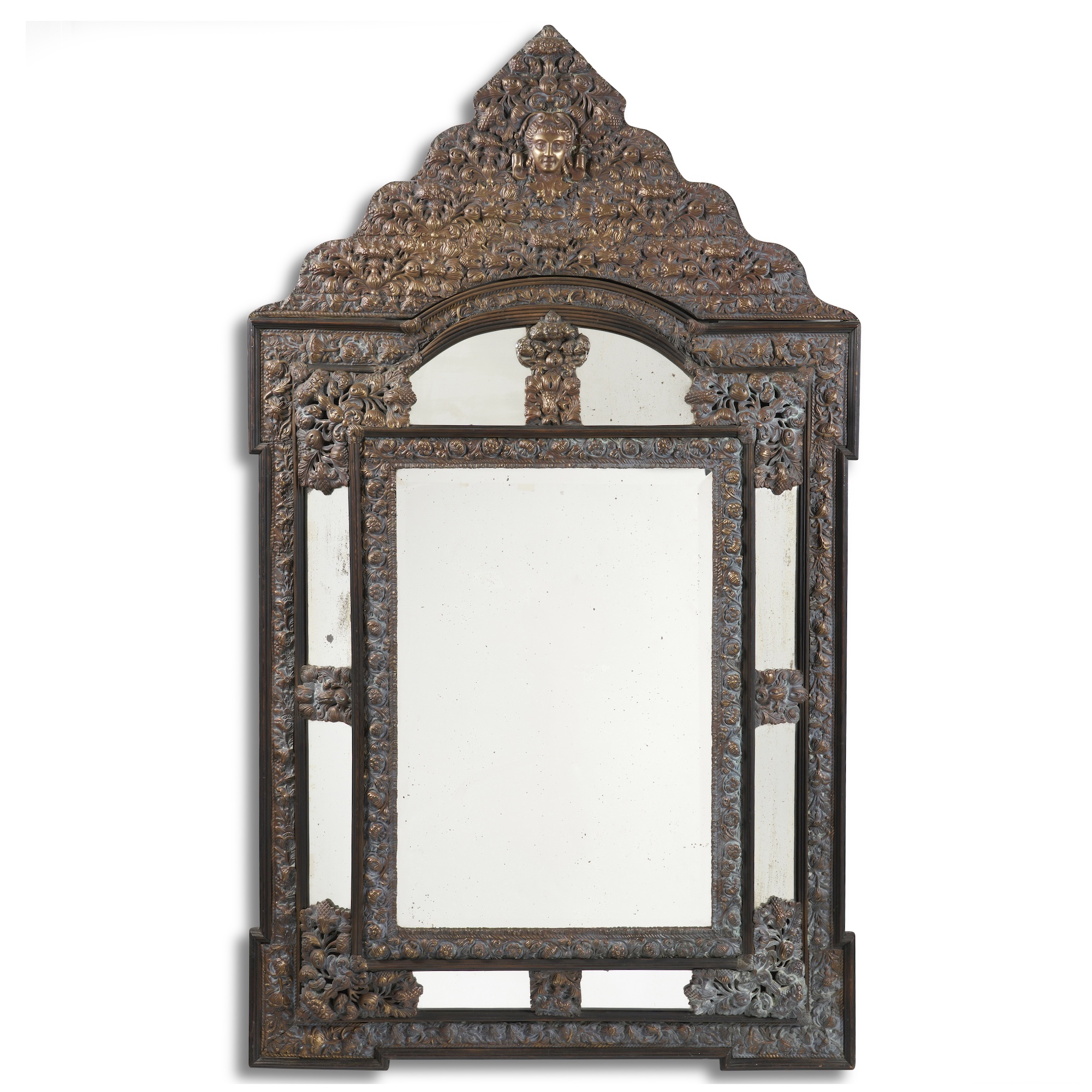 The bevelled rectangular main plate within receding marginal plates in a moulded and ebonised wood frame surmounted with a pediment, the frame with repoussé brass mounts of floral and foliate design throughout, the pediment centred with a Classical mask