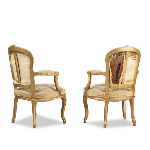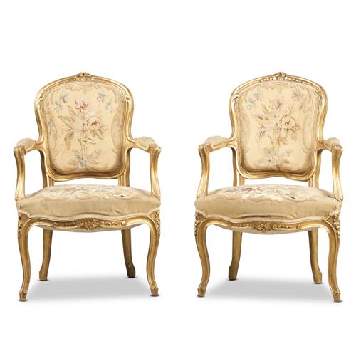 A PAIR OF ANTIQUE LOUIS XV-STYLE GILT-FRAMED FAUTEUILS