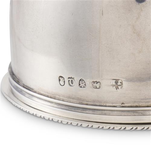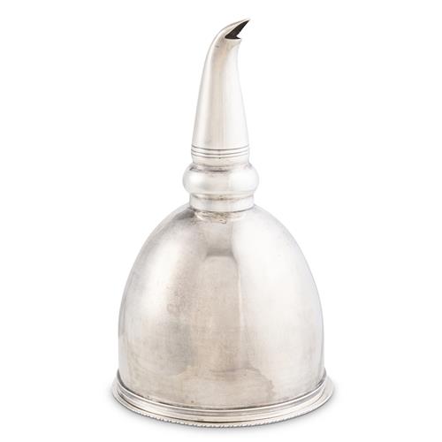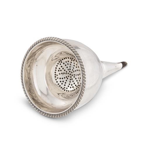 The decoratively perforated removable strainer with gadrooned rim fitting into the deep rounded bowl of the funnel, the head of the spout moulded and reeded