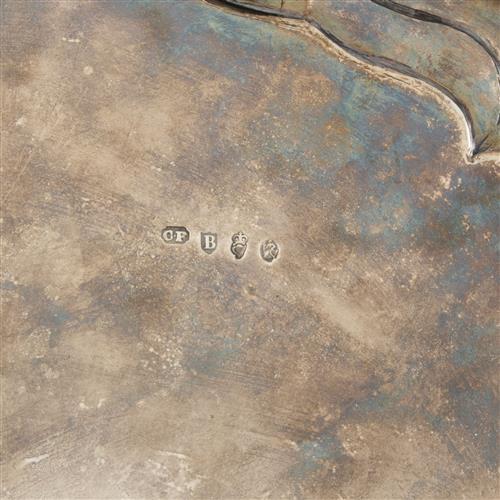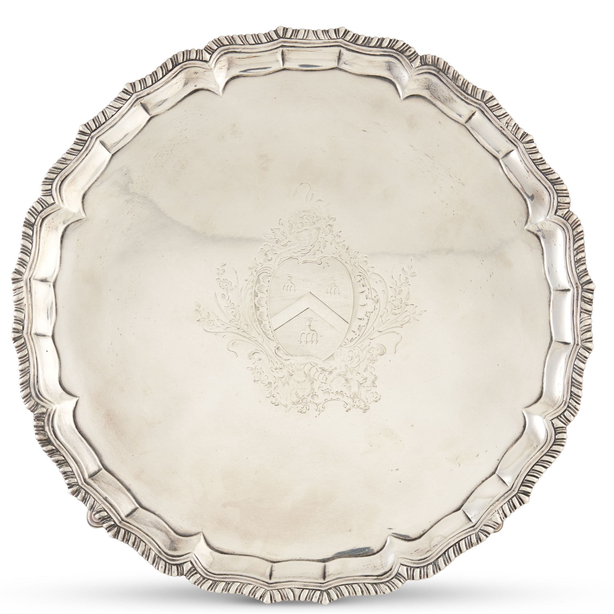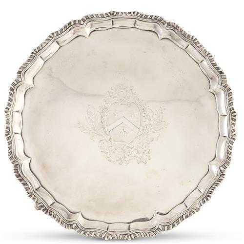 Of shaped circular outline, the raised sides with gadrooned edges, on four pad feet, the centre engraved with a coat of arms within a foliate mantle, stamped 'No. 59' to underside of edge