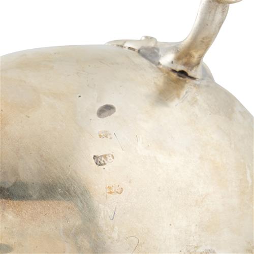Of typical boat form, with gadrooned rim and leaf-capped scrolling handle, on three anthemion-topped pad feet, engraved to one side with a crest of a falcon