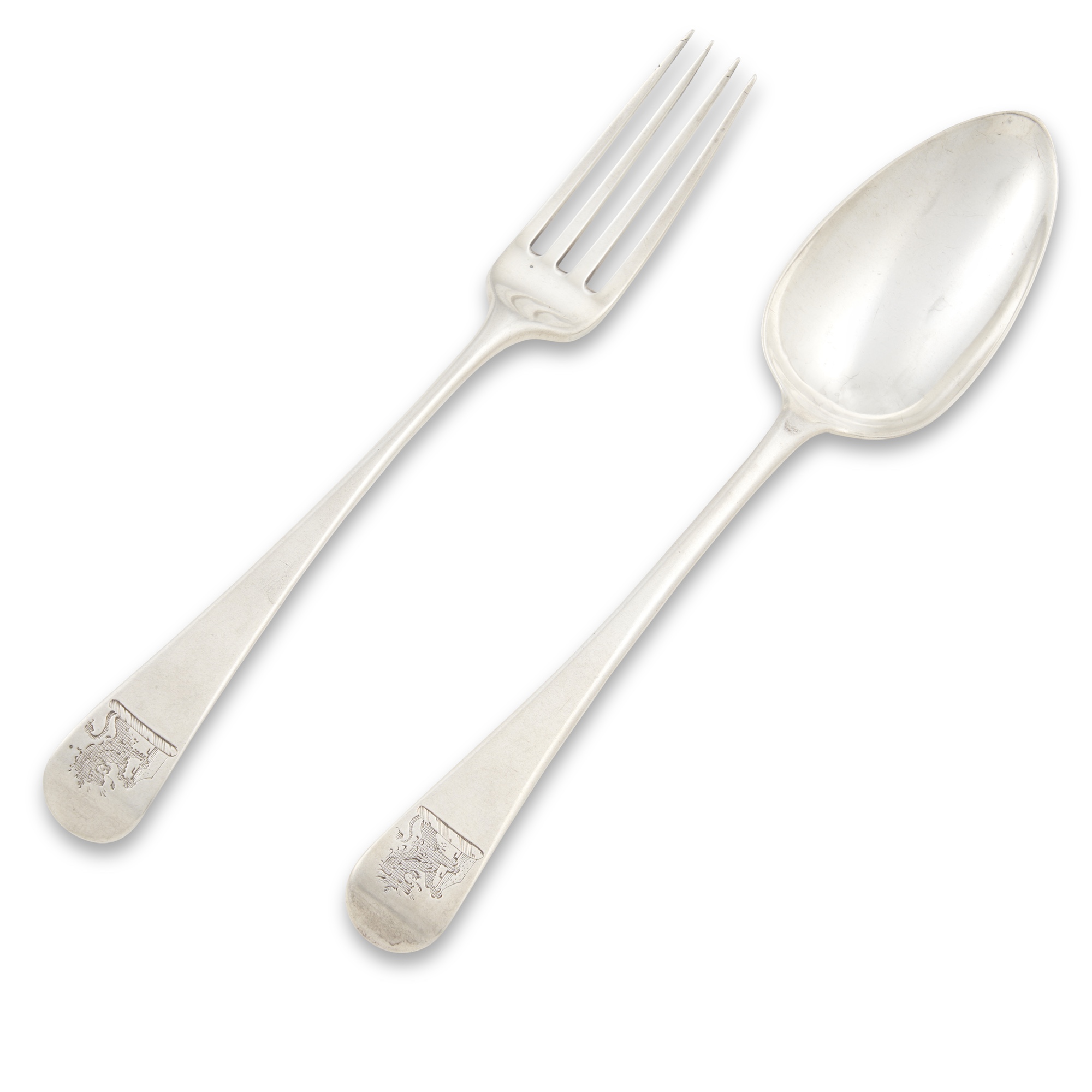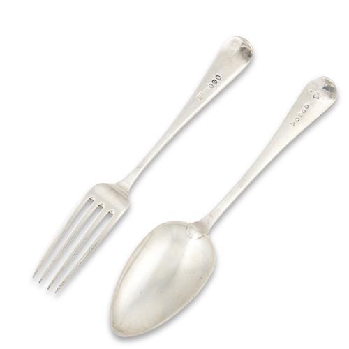 Comprising five dinner forks by Peter, Anne and William Bateman, London, 1802, three table spoons by Peter and Anne Bateman, London, 1793, and four table spoons by Richard Crossley and George Smith, London, 1807 together with another similar by John Osment, Exeter, 1854